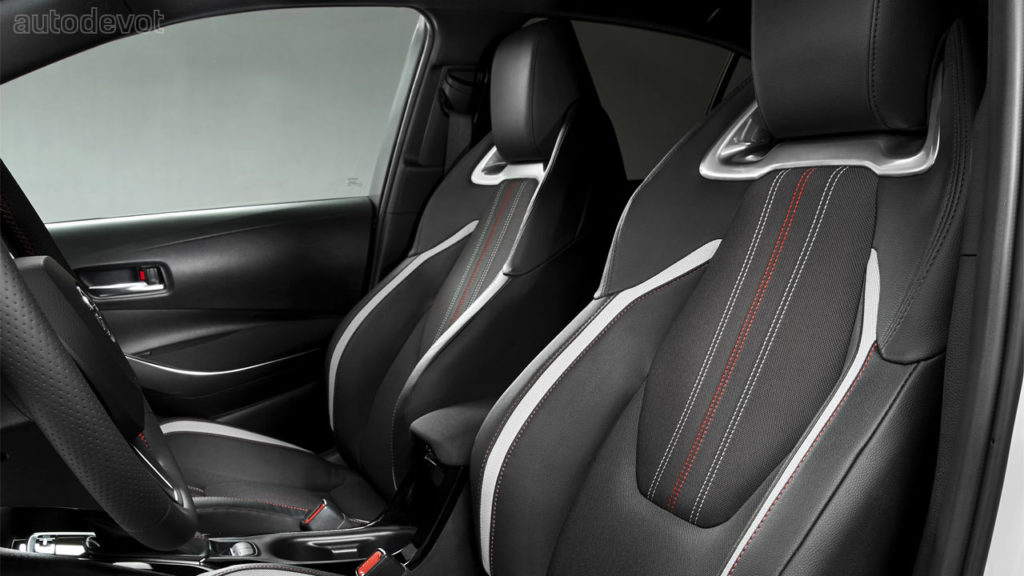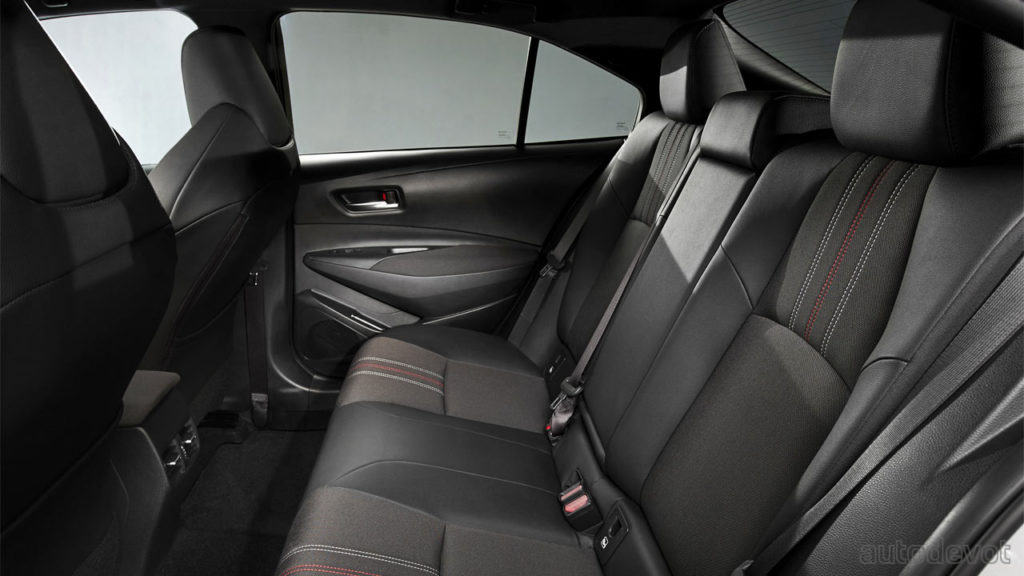 The cabin has an all-black theme going on with sporty front seats upholstered in a combination of black cloth and synthetic leather, with contrasting vertical stitches in white and red, matching the Gazoo Racing colors. The same color theme is applied to the rear bench seat.