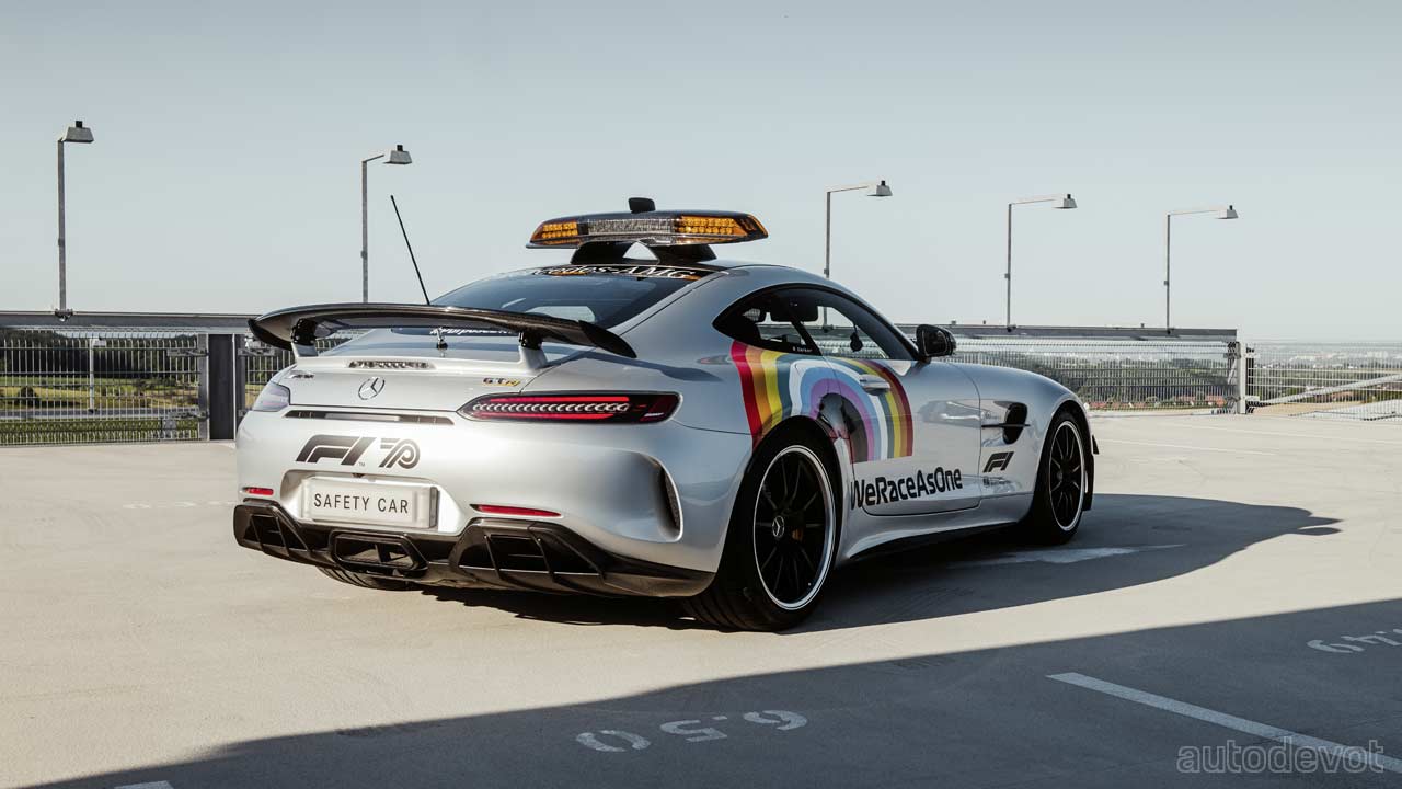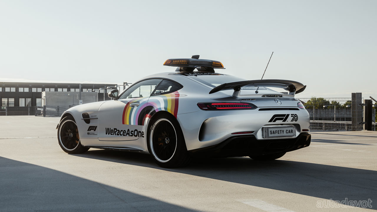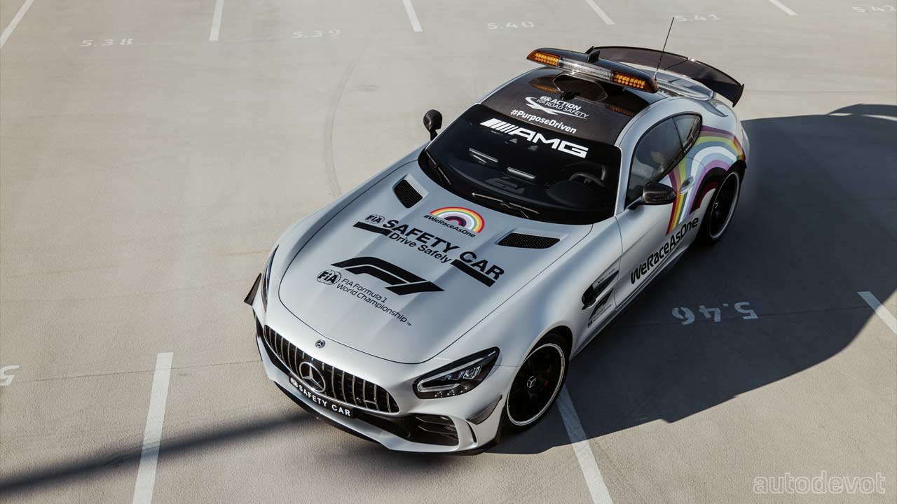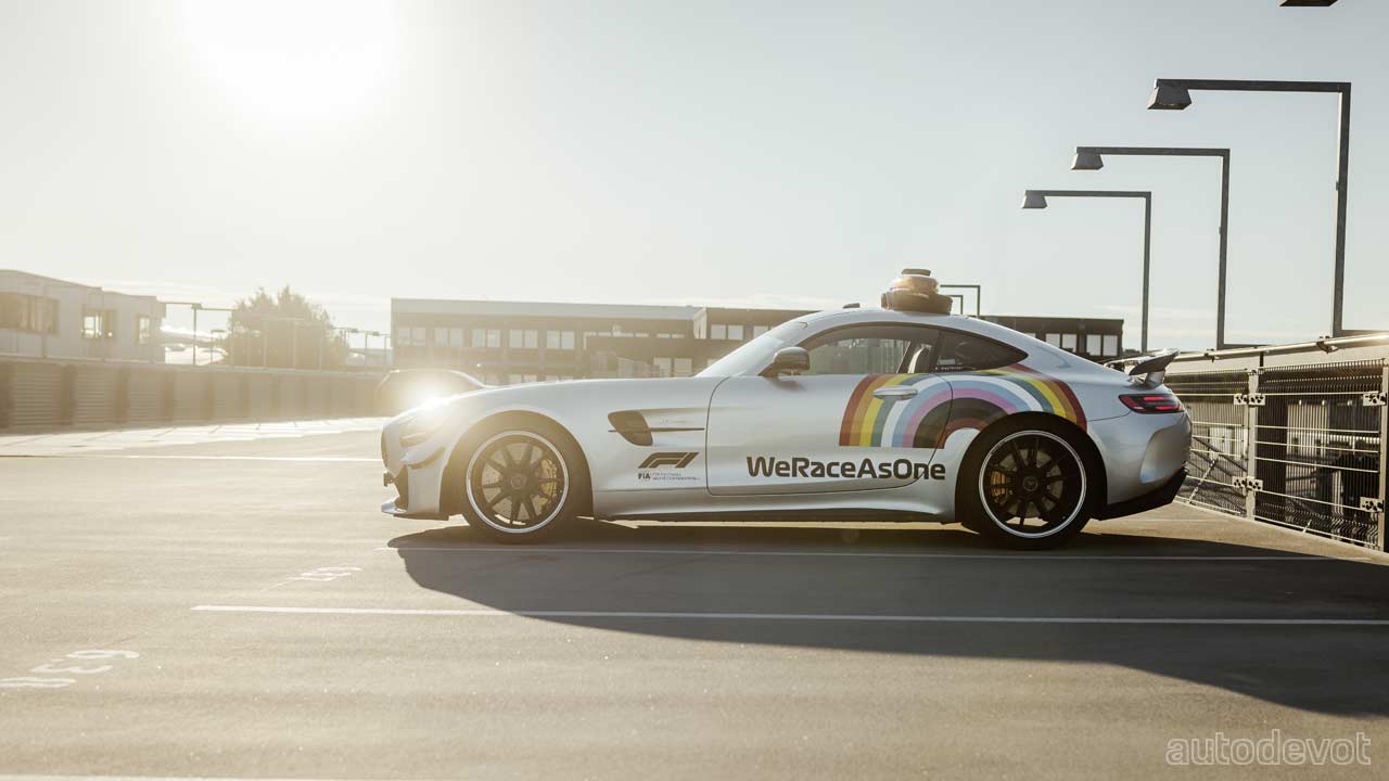 The official F1 safety car – the Mercedes-AMG GT R, is now sporting a new livery that supports diversity and the fight against racism. A rainbow graphics symbolizing the pride flag with “WeRaceAsOne” wordmark is featured on the car’s side profile and on the bonnet.