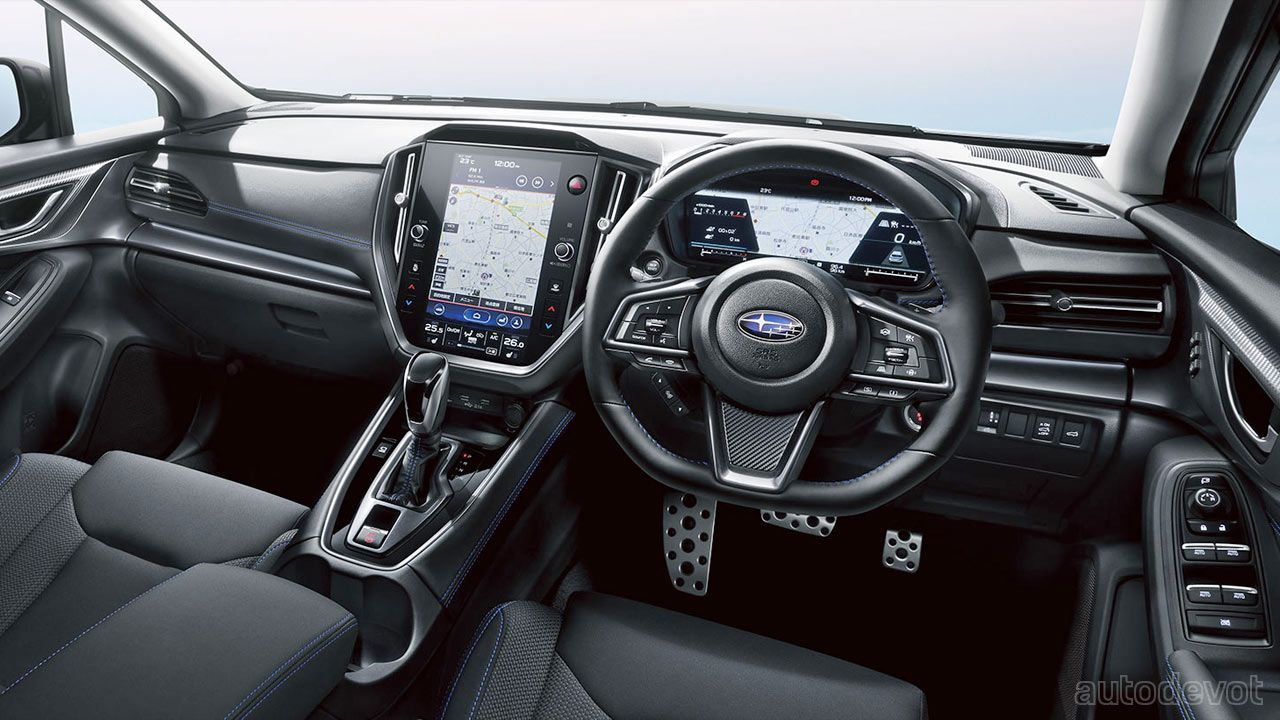 The cabin looks very contemporary with a 11.6-inch portrait-style central screen (optional), a 12.3-inch digital instrument cluster (standard on STI Sport EX), and aluminum pedals. The flat-bottom steering wheel is standard across the range.