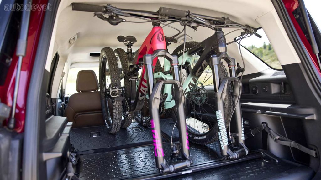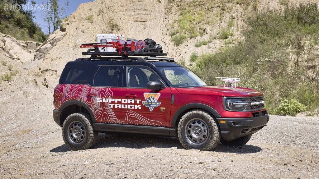 The last one is the Bronco Sport Off-Roadeo Adventure Patrol. Also based on the Badlands trim, it gets the Yakima LockNLoad Cargo platform to hold a high-lift jack, recovery boards and jerry cans; LED lightbar, and Yakima interior bike rack that can hold two mountain bikes. There’s also a target on the hood to land a drone.