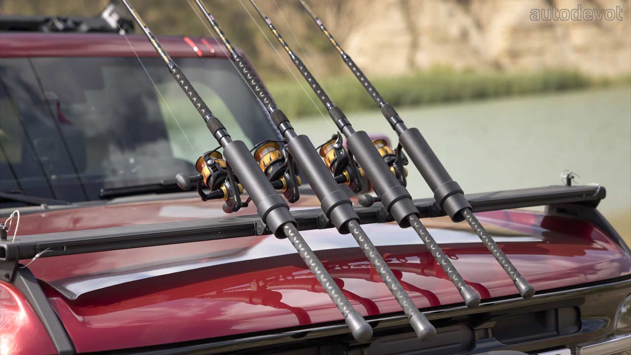 The first one is Bronco 4-door Outer Banks Fishing Guide. As the name suggests, it is based on the Outer Banks trim. The accessories include a Bestop Sunrider first-row soft top, roof rails and crossbars, and Yakima LockNLoad roof rack platform. There’s also a fender-mounted rail for custom-made fishing poles, which I think looks really, really good. A Ford Performance modular front bumper, safari bar, all-weather floor mats and splash guards round off the package.