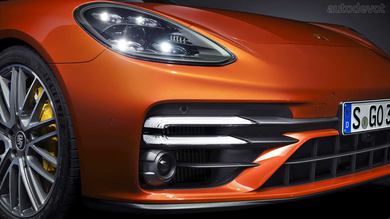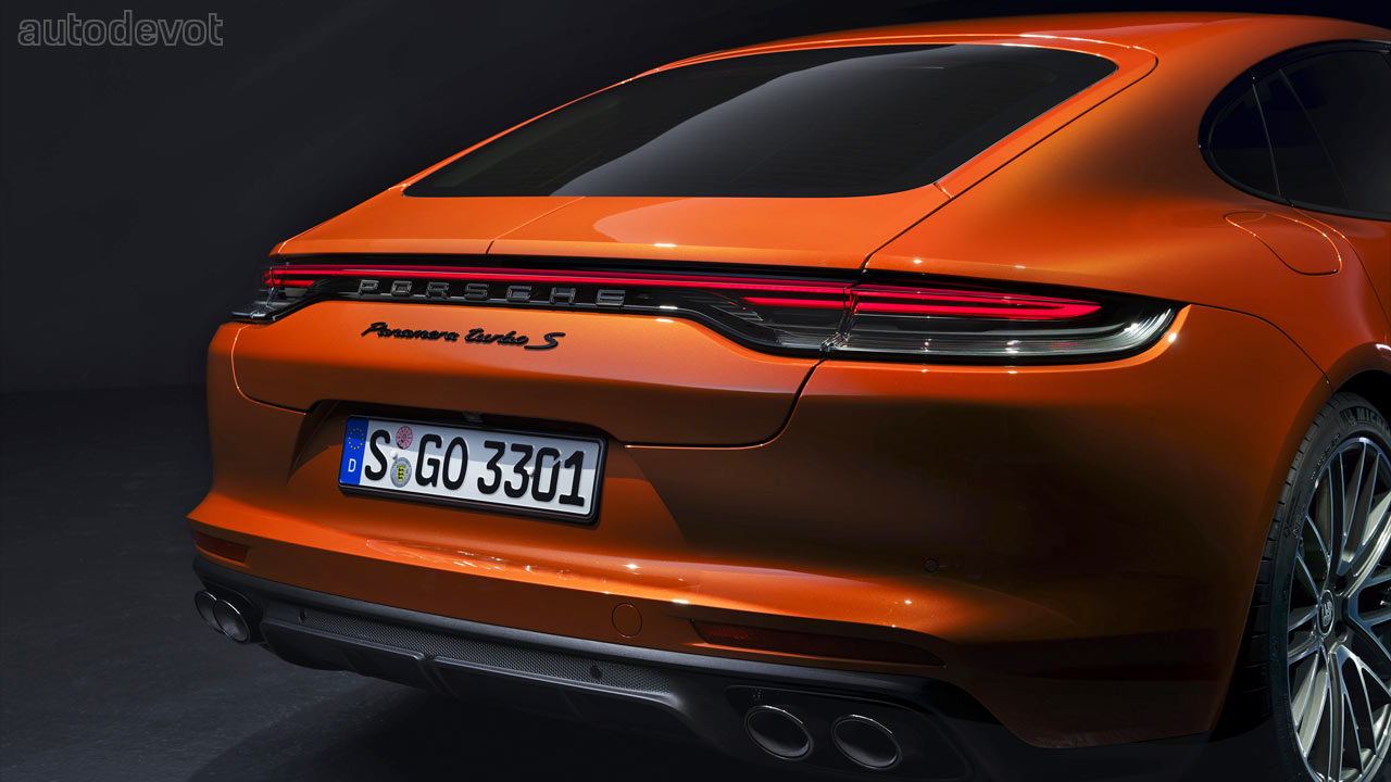 Speaking of which, the lineup now includes the Panamera Turbo S, which set a Nürburgring Nordschleife lap time of 7:38.46 minutes recently as a prototype. The 4.0L (3,996 cc) V8 biturbo engine has been tuned to produce 80 metric hp (59 kW) and 50 Nm (37 lb-ft) more than the previous Turbo, bringing the total to 630 metric hp (463 kW) and 820 Nm (605 lb-ft) of torque. A sports exhaust system with twin tailpipes on either side is standard.
