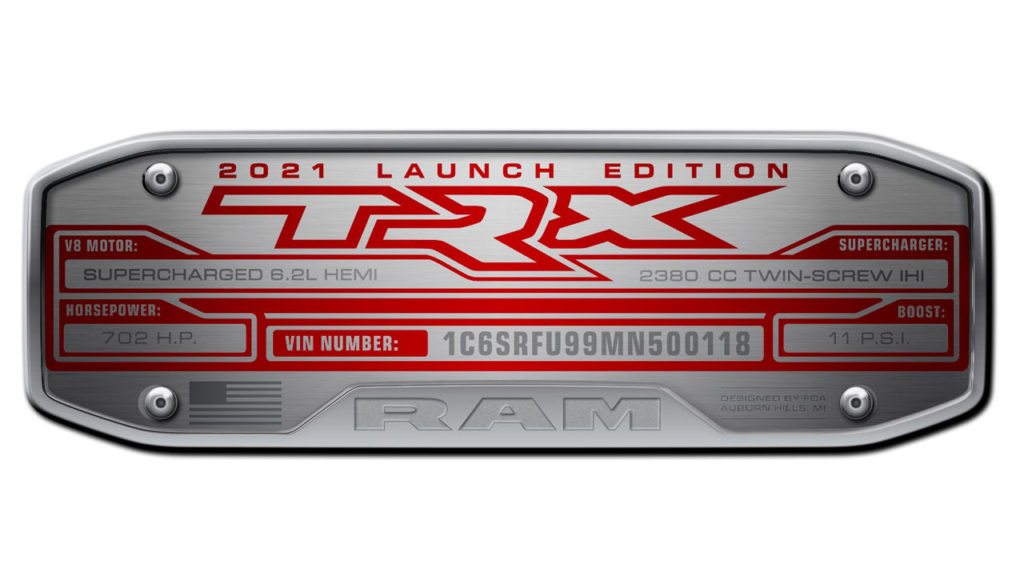 The 2021 Ram 1500 TRX Launch Edition (Anvil Gray) is limited to 702 units. Production will start later this year at FCA’s Sterling Heights (Michigan) Assembly Plant.