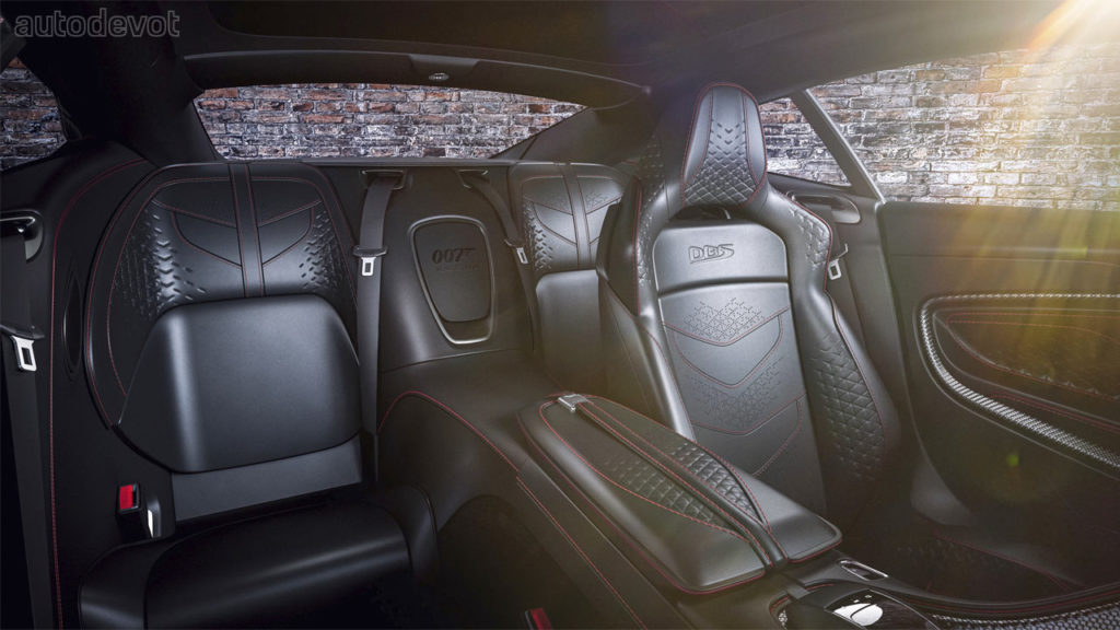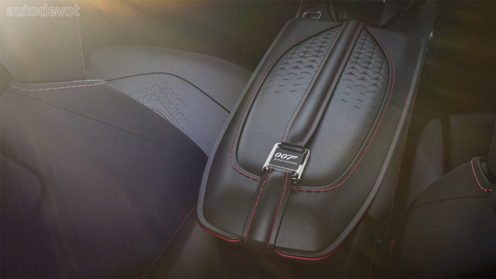 Inside, the dark cockpit of this DBS Superleggera features red contrast stitching and carbon fibre bits. Subtle 007 branding can be found on the door cards, armrest buckle badge and on the rear sub-woofer cover. Rounding off the 007 treatment is a sill plaque that recognises the car’s limited edition.