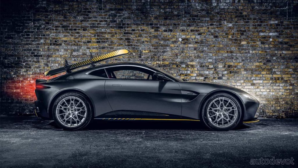 The Vantage 007 Edition on the other side, as mentioned, remembers the classic Aston Martin V8 in a 1987 Bond movie. It is limited to 100 units. The exterior is finished in Cumberland Grey with dashes in Yellow; the latter was apparently inspired by the hazard stripes on the film car’s rockets. The movie-inspired skis and ski rack is optional.