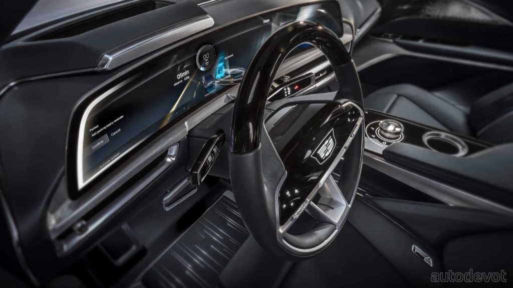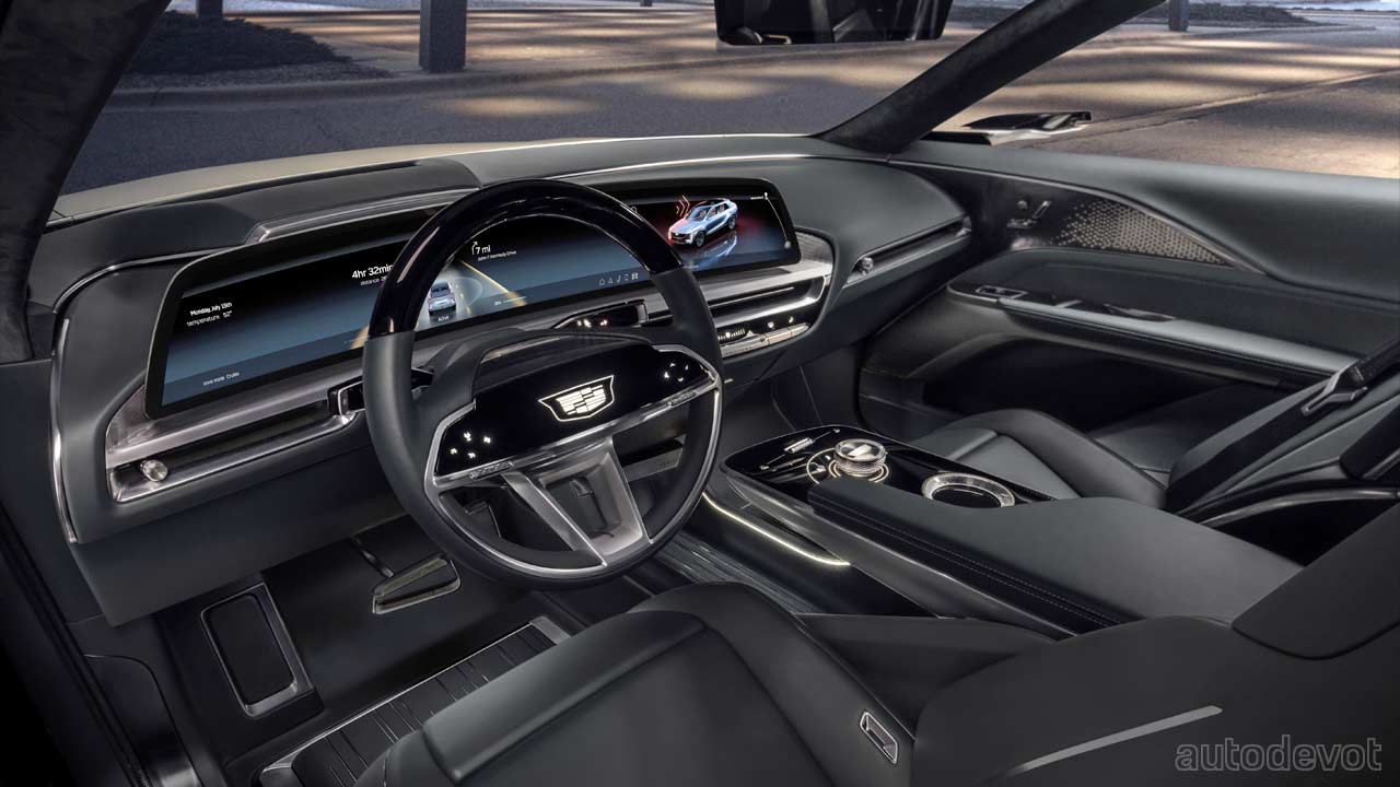 Inside, the dashboard is dominated by a wide, curved display, similar to that of the 2021 Escalade. Here in the Lyriq, it’s a 33-inch LED display that incorporates driver information details, infotainment controls and camera views. The rest of the cabin looks clean and minimal. Thankfully, there are some physical buttons and knobs too.