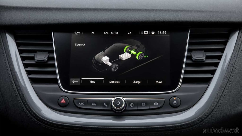 A blue light can be seen through the windshield; it has been integrated just underneath the interior mirror. When it glows blue, it is understood that the combustion engine is taking a break. The Grandland X offers a driver selectable EV mode.