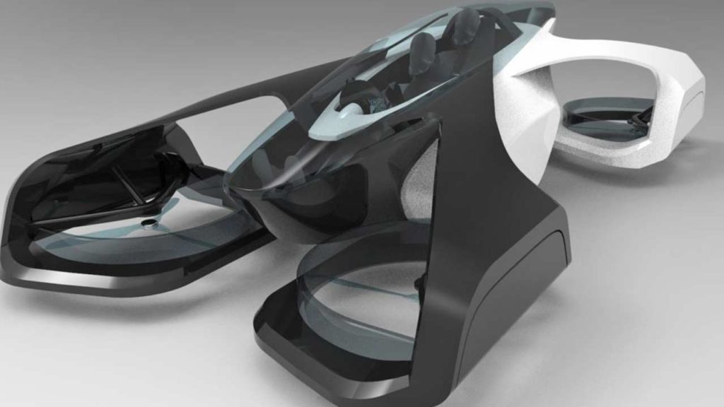 SkyDrive also has a two-seater concept called SD-XX, which I think closely matches the term “flying car”. It has got that modern hypercar-like silhouette and it can also fly. This one too has 8 electric motors that can lift the aircraft up to an altitude of ~500 m. It has a top speed of ~60 km/h (37 mph) and a range of up to 30 km (18 mi).