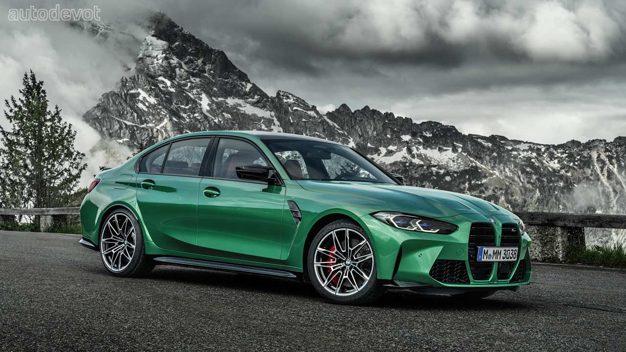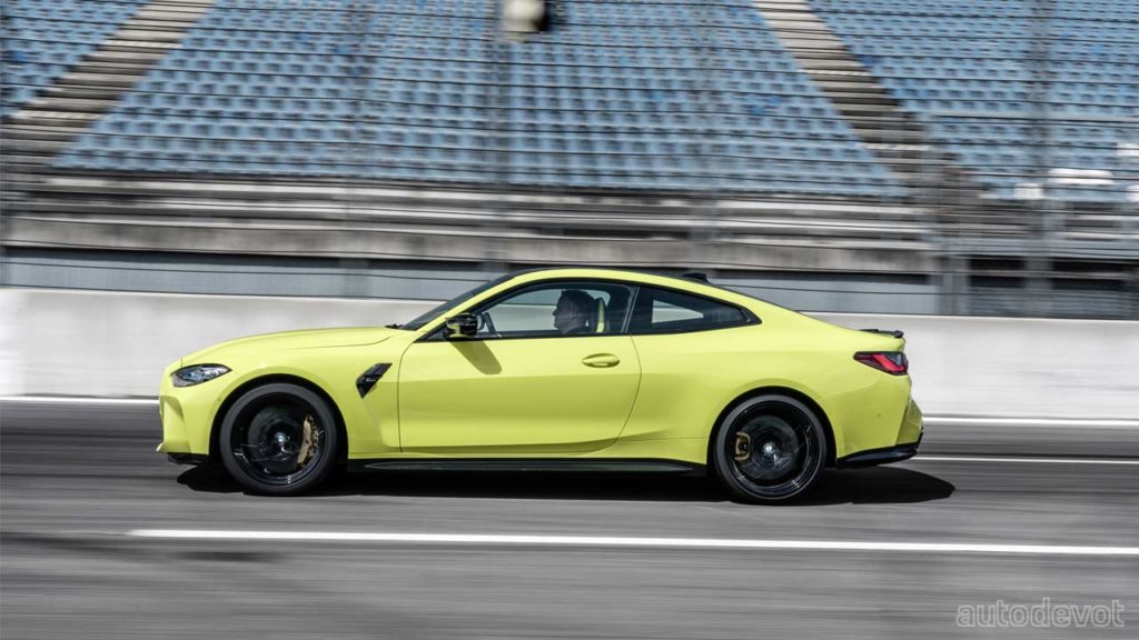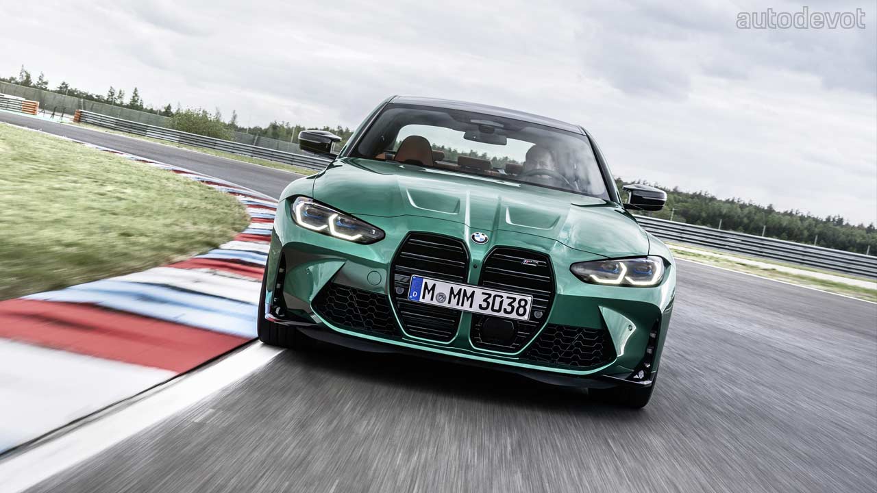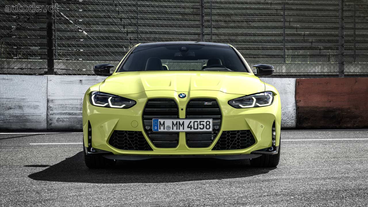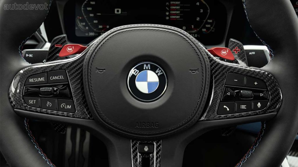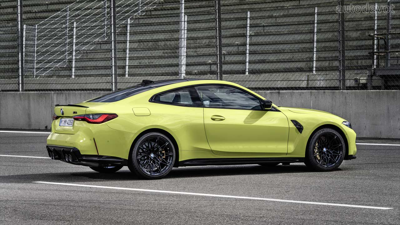The black grille-sort-of-a-thing you see on the front fender is just a plastic insert, but otherwise, the rest of the car looks pretty good. Both models also get CFRP roof as standard, which further cuts down the weight. Speaking of weight, the M3 Sedan’s unladen weight is 1,705 kg (3,759 lbs) while the Competition model weighs 25 kg (55 lbs) more. As for the M4 Coupé, the unladen weight is 1,700 kg (3,748 lbs) and its Competition sibling weighs 25 kg (55 lbs) more as well.