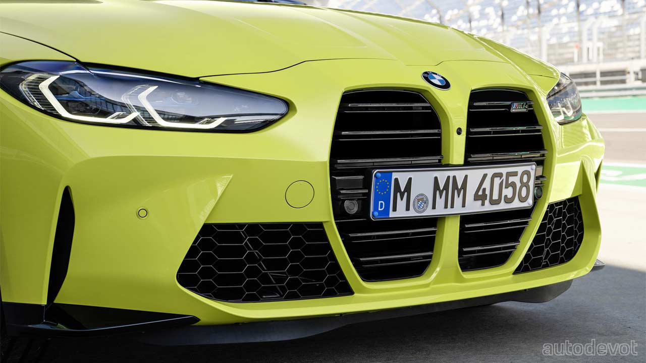 Unfortunately, the new M3 Sedan is also the victim of the Kidney grille disaster; I think it should have got the front fascia based on the G20 3 Series. Anyway, the one advantage I guess is that there won’t be any shortage of air that flows into the engine bay as all of the intakes, openings and air curtains you see here, are functional. In fact, the valley you see in the middle of the bonnet, makes the Kidney grille look like a giant pair of suction tunnels. In the M4 Coupé, the grille is taller than in the 4 Series Coupé we saw in June.