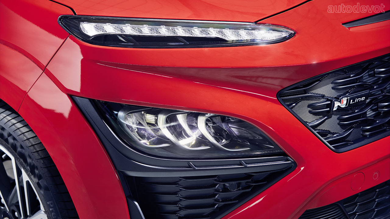 As for the styling tweaks, well, the new Kona is still recognizable as a Kona with its dual-lamp setup. However, the narrow upper slit has been closed off and replaced with the Hyundai logo. The main grille now looks a bit wider and there’s a restyled bumper with a larger lower grille. And yes, the LED running lights are narrower than before and the headlights are of a new design.