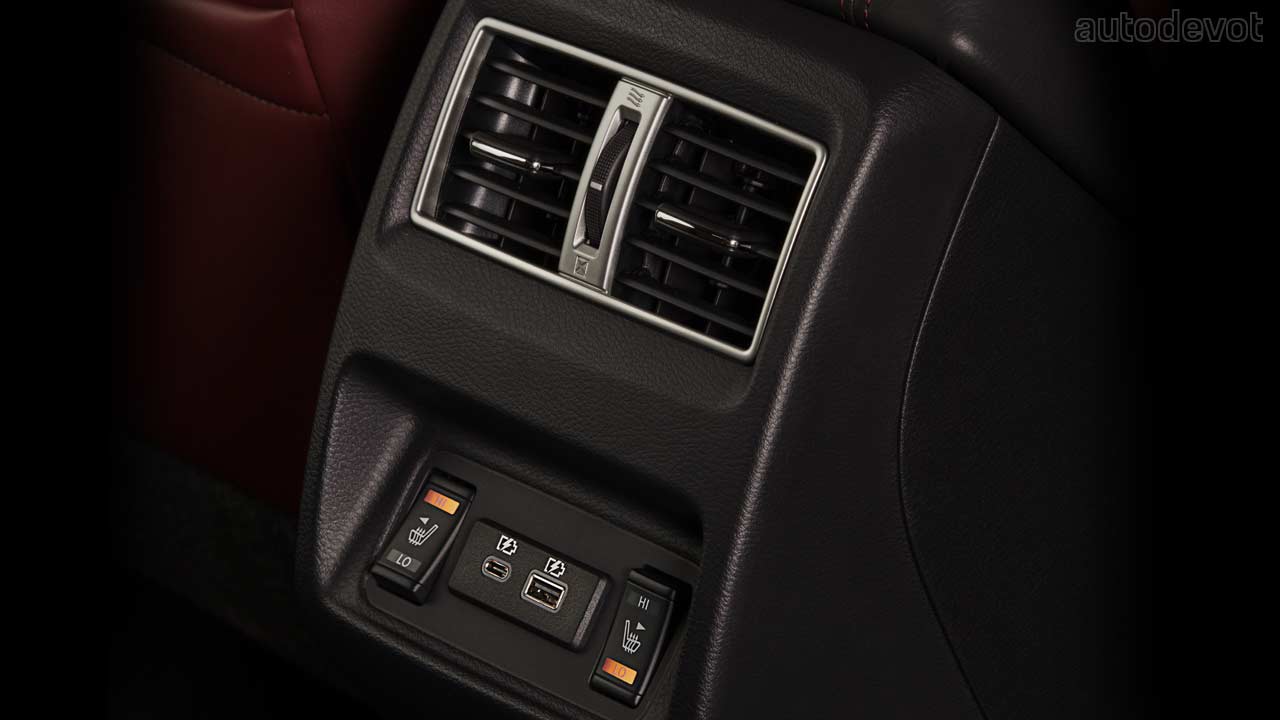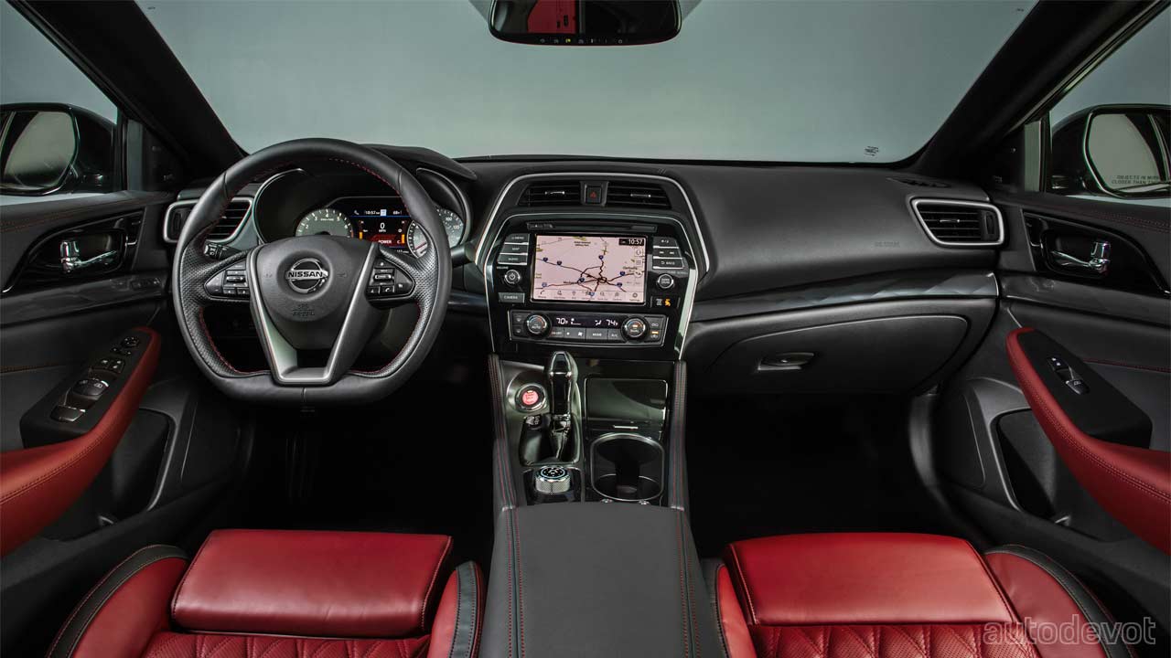 The cabin features red semi-aniline leather seat upholstery with 40th Anniversary embossing; red contrast stitching, satin dark chrome accents, white speedometer and tachometer faces reminiscent of past Maxima models, and heated rear seats.