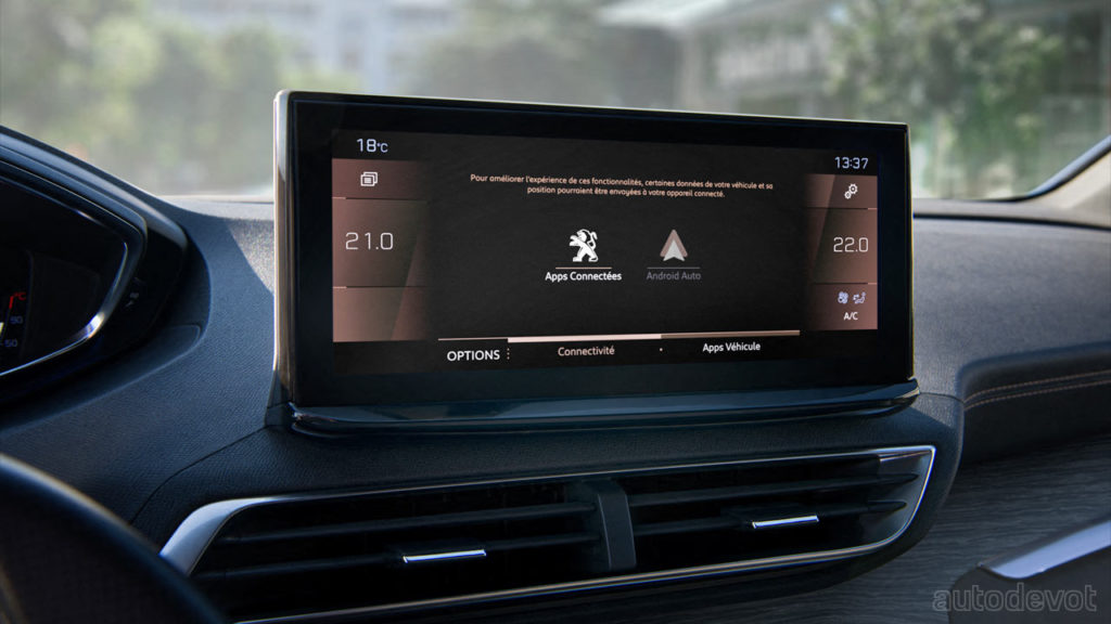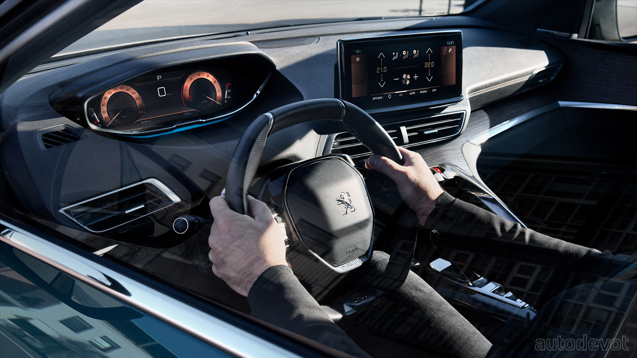 The refreshed interior gets a new i-Cockpit system comprising a 12.3-inch digital instrument cluster and a 10-inch central infotainment display; the latter boasts 3D connected navigation. Options include a 515-watt Focal audio system. Depending on the trim, there are new materials such as red Nappa leather upholstery and Alcantara lining.
