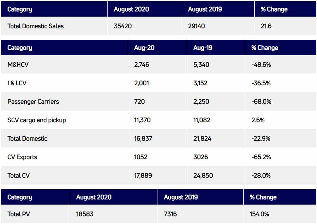 Sales in the domestic and international markets for August 2020 stood at 36,472 vehicles, registering a growth of just over 13% compared to 32,166 units sold during August 2019. Total domestic sales saw a Y-o-Y growth of 21.6%.