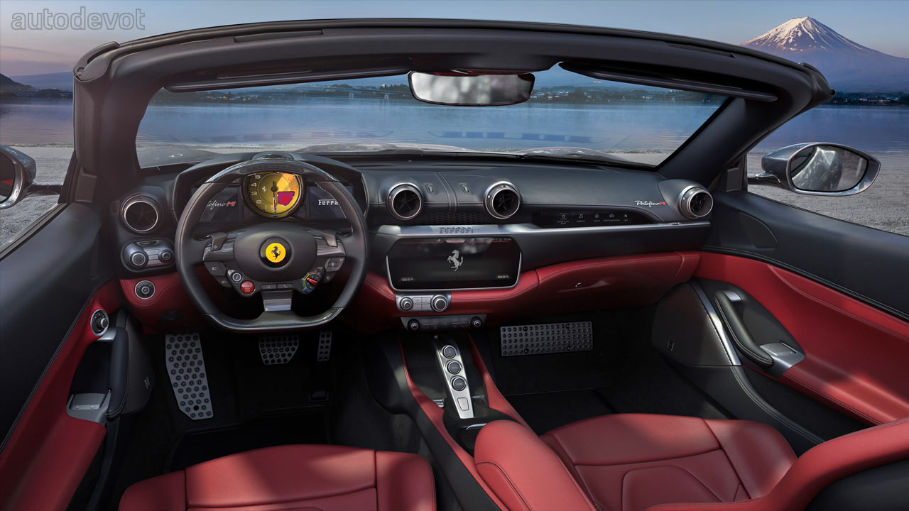 The 3.8-litre (3,855 cc) V8 twin-turbo pumps out 620 hp (456 kW) at 7,500 rpm, which is about 20 hp more than the Portofino, while the peak torque will remain the same at 760 Nm (560.5 lb-ft). To extract more power, Ferrari engineers used new cam profiles to increase valve lift and optimize combustion chamber filling. Also, a speed sensor was added to the turbocharger assembly to measure the turbine revolutions, which allowed the maximum rpm of the turbine to be increased by 5,000 rpm. And, in order to comply with Euro-6D emissions standards, a Gasoline Particulate Filter has been included in the exhaust system.