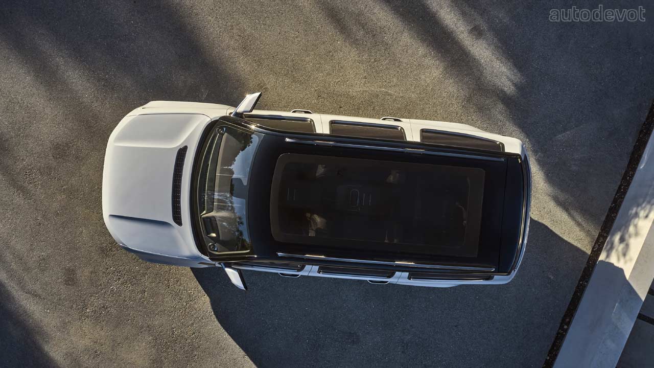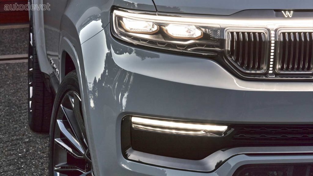 Jeep classifies the new Grand Wagoneer we’re seeing here as a “concept”, although it almost looks like it is ready to roll off the production line. In terms of the styling, it does look like an evolved version of the original Wagoneer with its long bonnet, squared-off front fascia and overall boxy looks. The concept has a continuous LED strip that connects the LED projector headlights, however, at the rear, the light strip is broken into two parts for some reason. The front doors feature the “Grand Wagoneer” wordmark in aluminum followed by the American flag. Also, notice the tow hooks at the front. The dual-tone paint scheme creates a clean-looking floating roof effect.