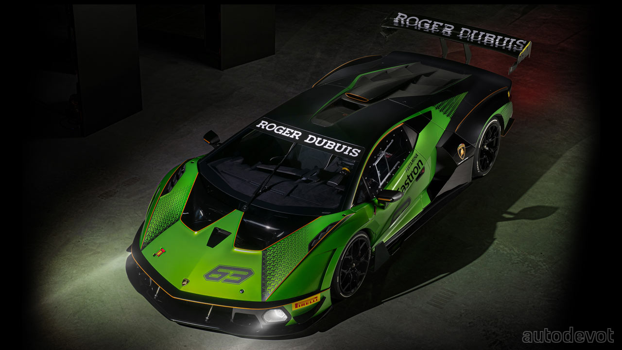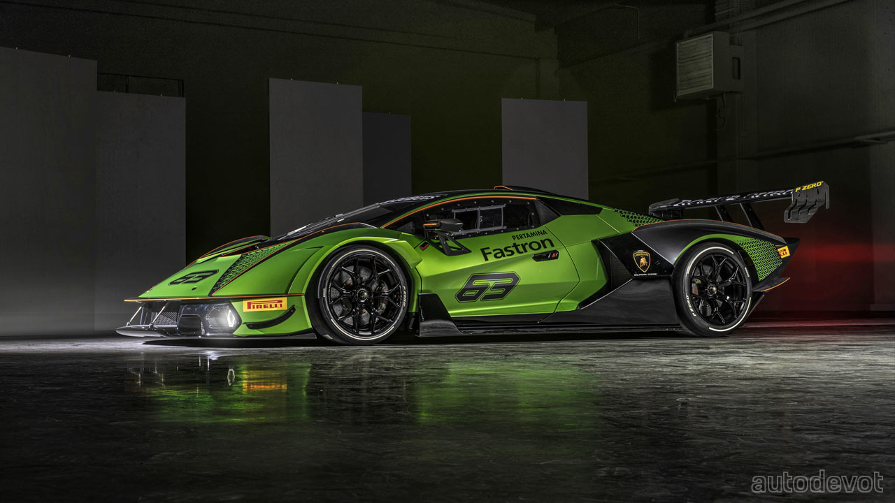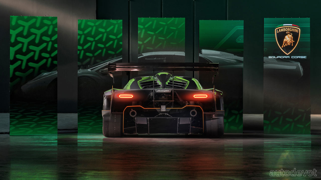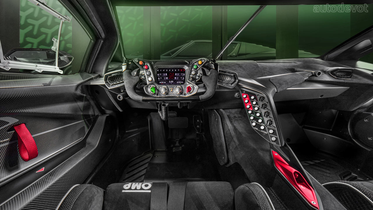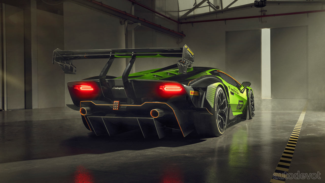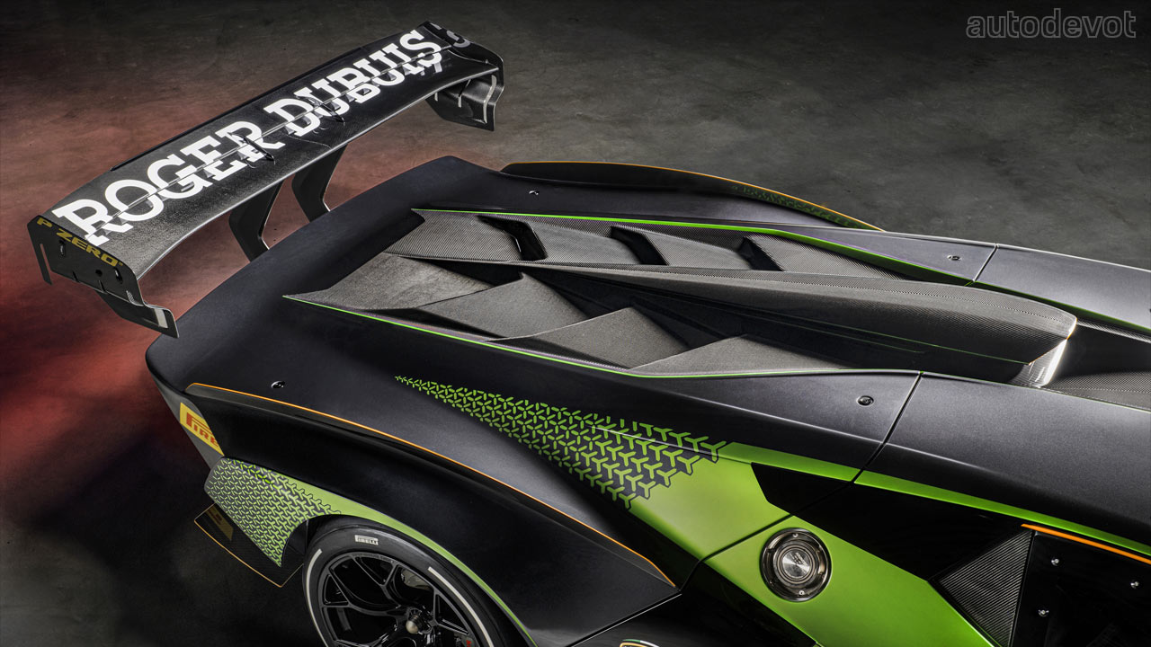 The front splitter has two lateral elements while at the rear, there’s a massive, double-profile adjustable wing. Lamborghini estimates the downforce to be higher than a GT3 car, with over 1,200 kg (2,645 lbs) at 250 km/h (155 mph).