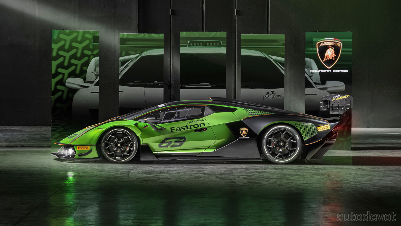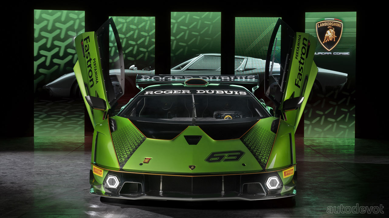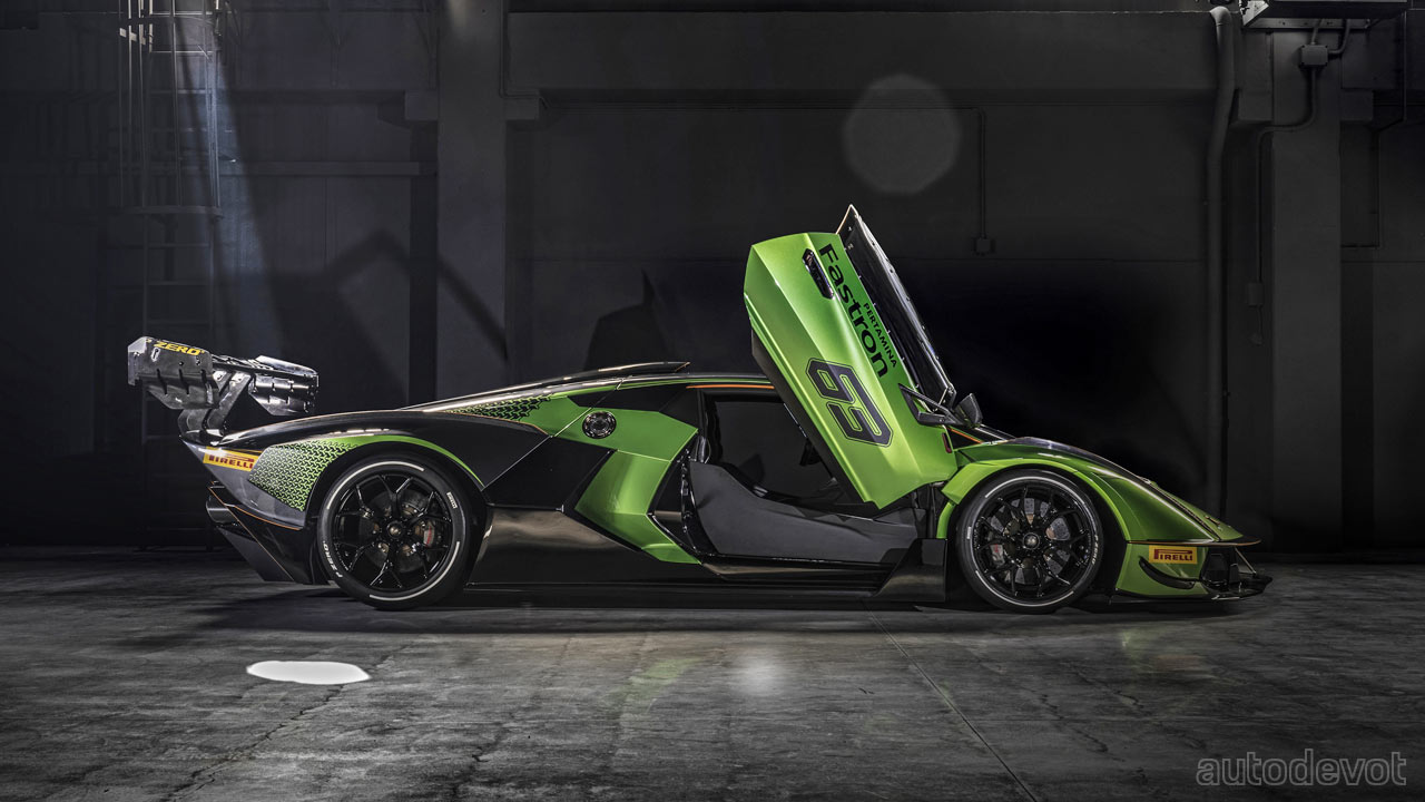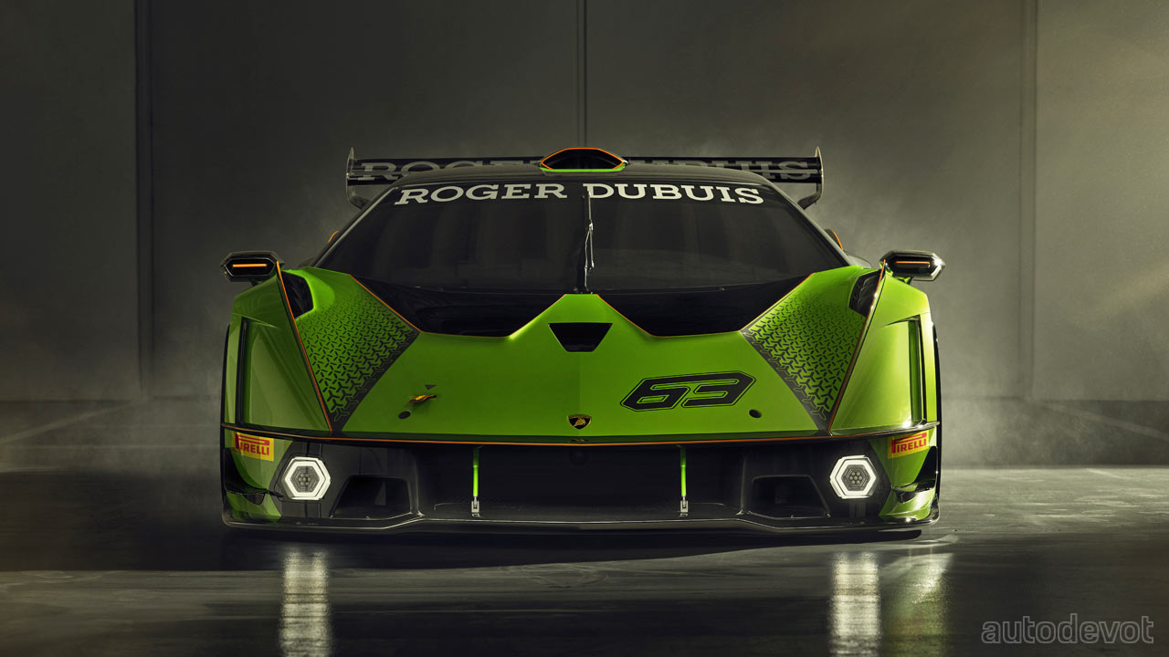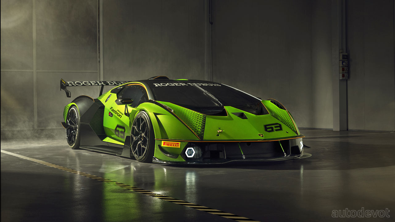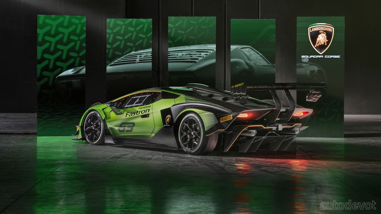 The front splitter has two lateral elements while at the rear, there’s a massive, double-profile adjustable wing. Lamborghini estimates the downforce to be higher than a GT3 car, with over 1,200 kg (2,645 lbs) at 250 km/h (155 mph).