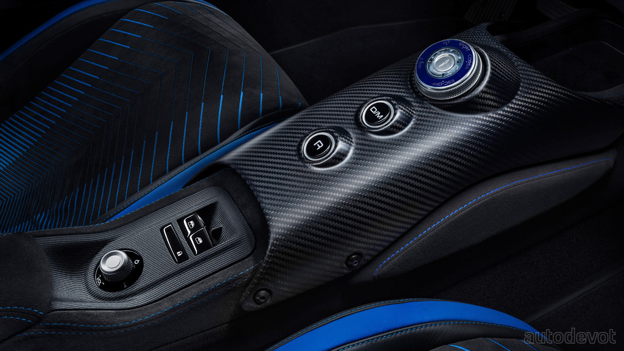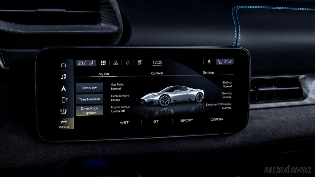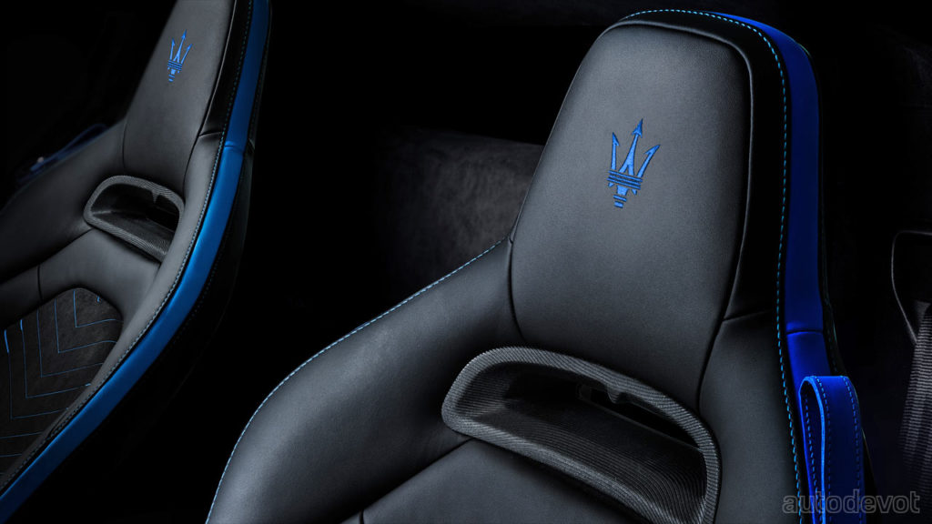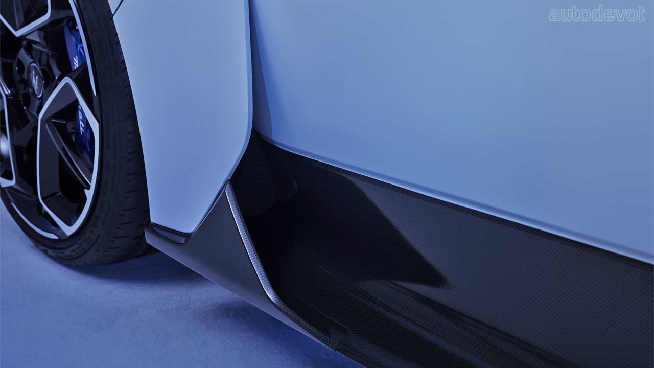There’s a 10.2-inch digital instrument cluster and a 10.25-inch floating infotainment display, which look pretty similar to the ones found in a Mercedes car these days; perhaps it’s the same supplier. The seats come from Sabelt and with laser-generated contrast blue highlights. The material choices include leather, Alcantara and of course, carbon fibre. The options list includes a Sonus Faber premium audio system.