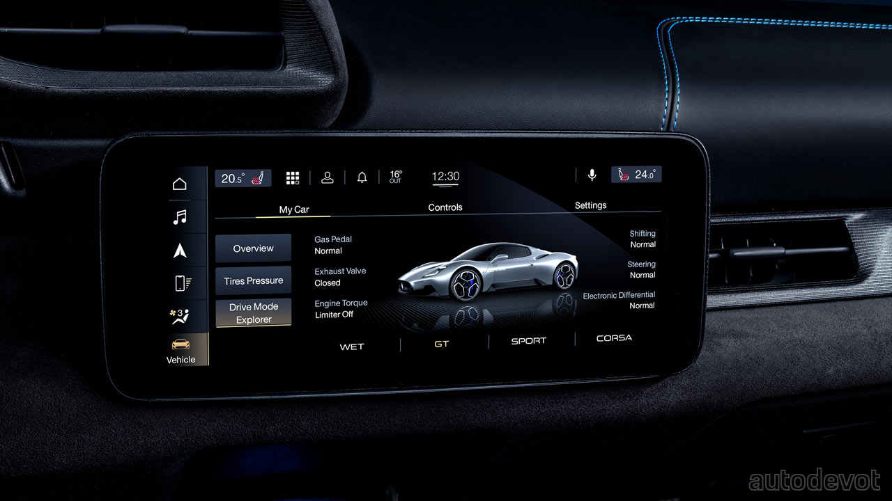 The wheels measure 20-inch at both axles, shod with tyres measuring 245/35 at the front and 305/30 at the rear. The discs measure 380 x 34 mm at the front with Brembo 6-piston calipers and 350 x 27 mm at the rear with 4-piston calipers. As for the dimensions of the car itself, the MC20 measures 4,669 mm in length, 1,965 mm in width and 1,221 mm in height. It has a wheelbase of 2,700 mm. The total luggage capacity is claimed to be 150 litres.
