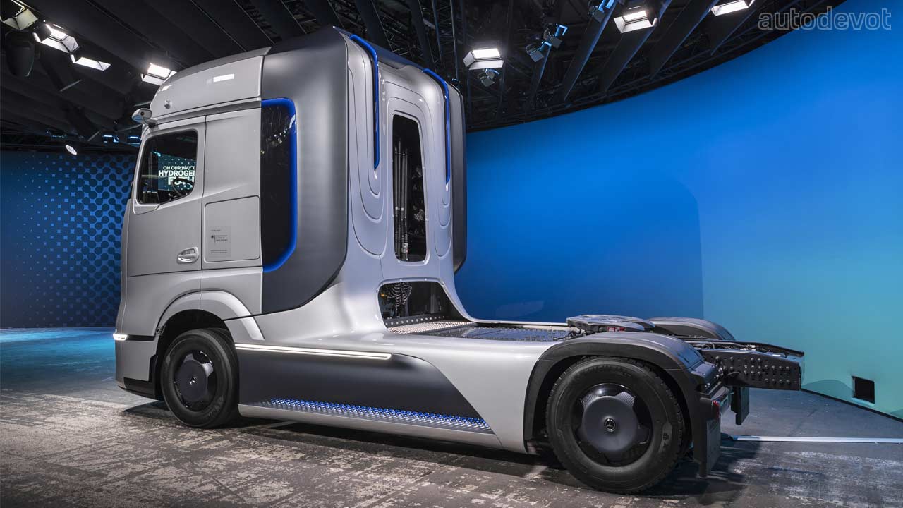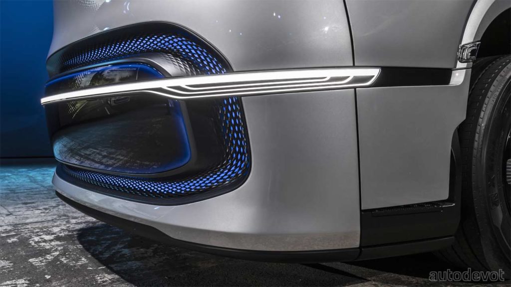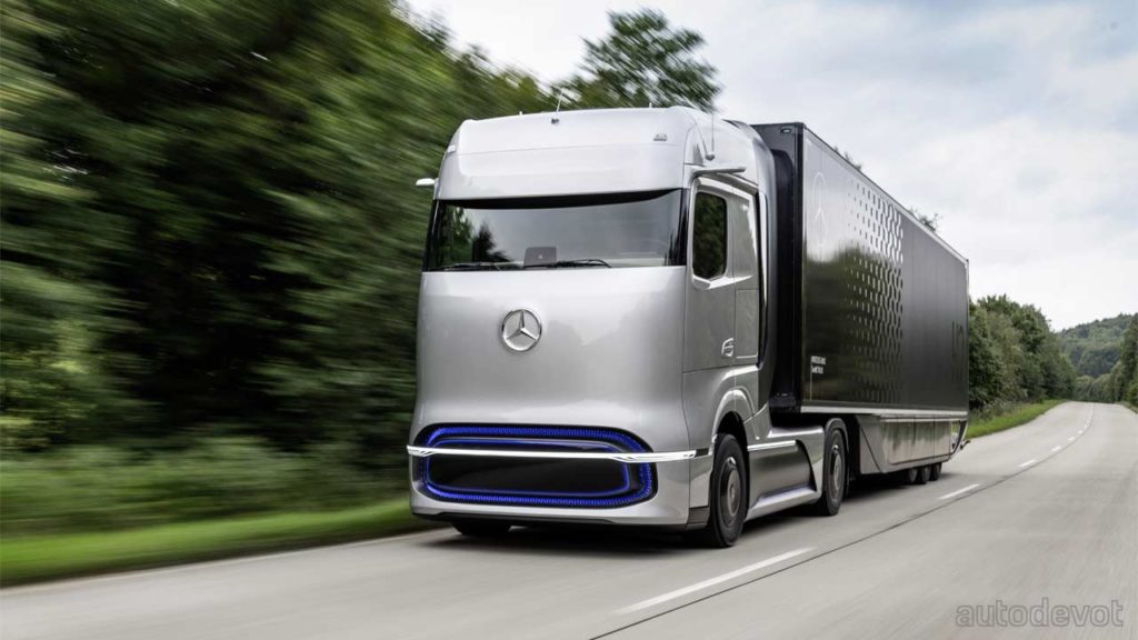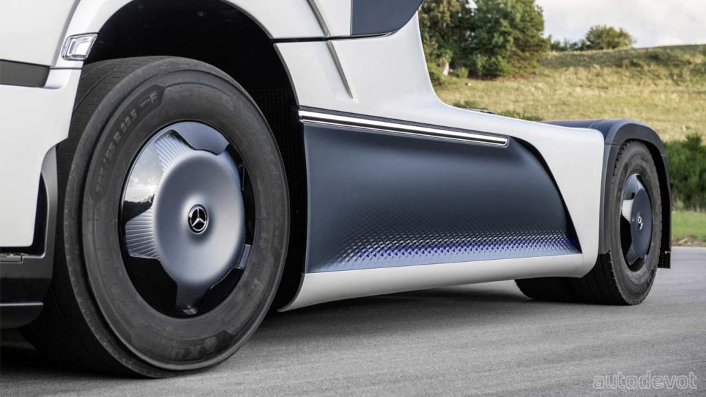 The third one is a futuristic-looking truck called GenH2, which is also of the same class as the LongHaul. The important difference is, of course, the GenH2 is a fuel-cell truck. Mercedes expects a range of up to 1,000 km (621 mi). Just as the company did customer trials with the smaller eActros, the GenH2 will also be real-world tested by a few customers starting in 2023, before going into series production in the second half of this decade.