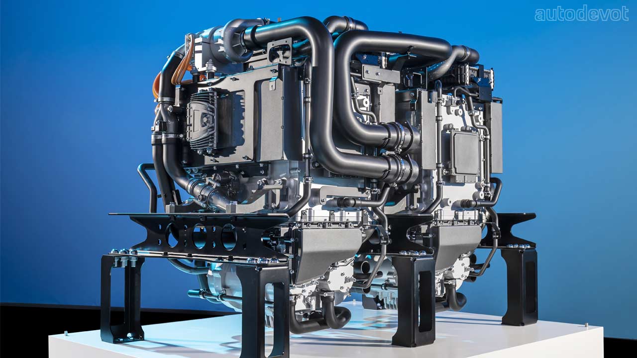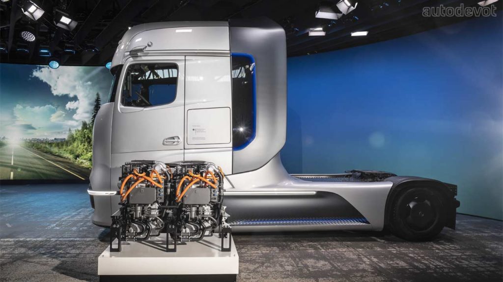 The series production GenH2 will have a gross vehicle weight of 40 tons and a payload of 25 tons. It’ll have two stainless-steel liquid-hydrogen tanks with a storage capacity of 40 kg (88 lbs) each. The fuel-cell system is to supply 2 x 150 kW while the battery will provide an additional 400 kW temporarily. The battery pack is of a relatively low 70 kWh capacity, as it is mainly intended to provide temporary supply such as while accelerating or while driving uphill fully loaded. The pre-production version will have two electric motors with 2 x 230 kW (313 hp) continuous power and 2 x 330 kW (449 hp) maximum power outputs; torque is 2 x 1,577 Nm (1,163 lb-ft) and 2 x 2,071 Nm (1,527 lb-ft), respectively.