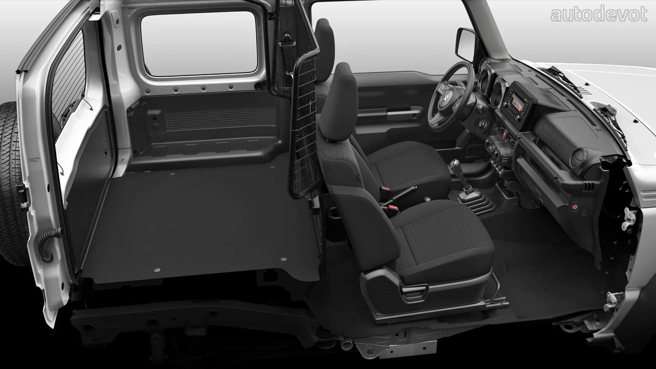 The rear seats have been let go for a flat cargo space, and there’s also a safety cargo partition. The exact cargo capacity will be 863-litres — 33-litres more than the passenger version when the rear seats are folded down. The Jimny LCV will also come with safety systems including Dual Sensor Brake Support (DSBS), and eCall — an emergency messaging function in case of a collision.