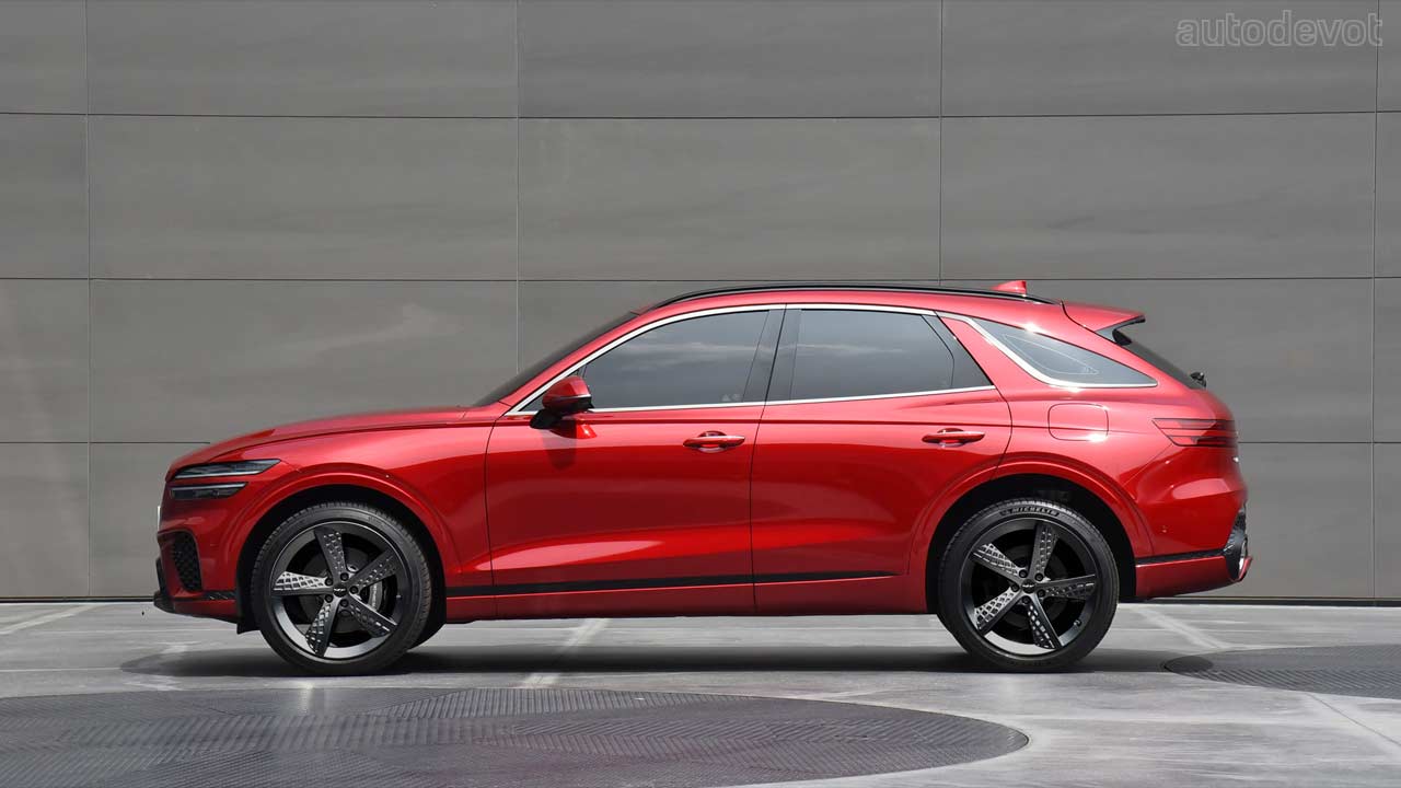 As we can see from the photos, there’ll be two variants at launch — the regular GV70 and the GV70 Sport; the latter indeed looks sporty, especially in this Red paint, dark chrome elements, and 21-inch wheels with G-Matrix pattern. The G-Matrix pattern was apparently inspired by the reflection of diamonds. Also, the Sport variant with its round tailpipes kinda reminds me of the Alfa Romeo Stelvio, especially when you combine that with Coupe-SUV rear profile. But overall, I think it’s a sexy looking crossover. In case you’re wondering, the ‘V’ in the name according to Genesis, represents “versatility”.