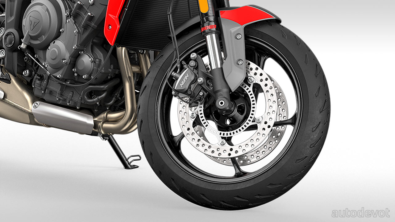 Braking duties are handled by twin 310 mm discs at the front with Nissin two-piston sliding calipers, and a single 255 mm disc at the rear with a Nissin single-piston sliding caliper. The wheels are 17-inch cast aluminum ones, wrapped with Michelin Road 5 tyres measuring 120/70 at the front and 180/55 at the rear. A Tyre Pressure Monitoring System can be found in the options list.