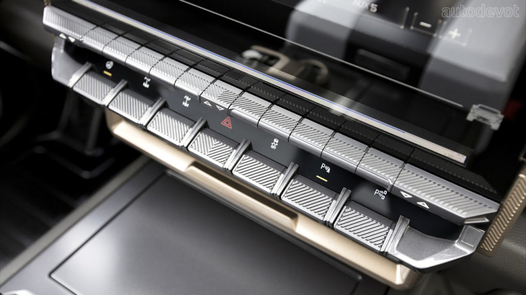 The cabin has that typical utilitarian layout with generous squares and rectangles throughout. Although not a copy, the dashboard might remind you of the one in the Rivian. Also, notice the ‘H’ motif on the steering wheel and on the air vents as well. Depending on the trim, the features list includes a 13.4-inch infotainment display, 12.3-inch driver display, 14-speaker Bose audio system, and adaptive air suspension.