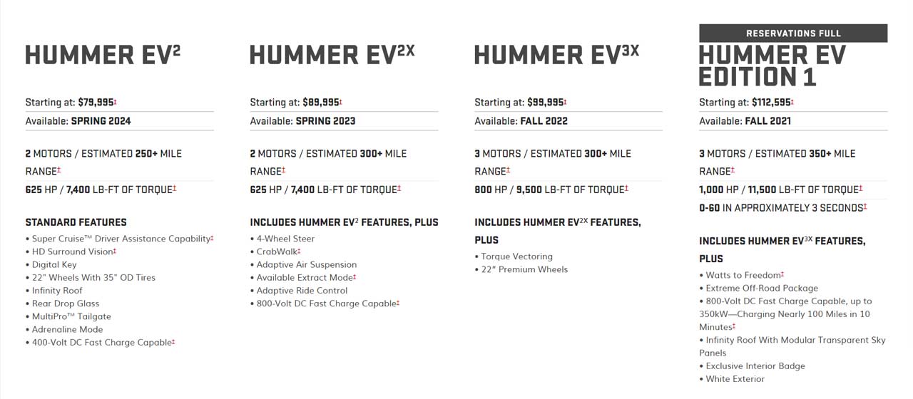 As we can see in the list above, there’ll be three main trims and the base Hummer EV2 with a starting price tag of $79,995 is not available until 2024, while the Edition 1 with a price tag of $122,595 is claimed to be sold out. The tri-motor EV3X priced at $99,995, is the next in line, followed by the EV2X with $89,995 starting price.