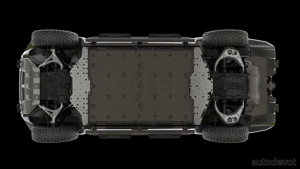 When it comes to off-roading credentials, the Hummer EV boasts 4 Wheel Steer with CrabWalk, which enables the rear wheels and front wheels to steer at the same angle at low speeds, enabling diagonal movement of the vehicle, for even greater maneuverability on challenging terrains. The list includes Extract Mode with suspension rising up to 6-inches (149 mm); underbody armor with steel plates; and UltraVision with front and rear underbody cameras. All of these are standard on the Edition 1 as part of the Extreme Off-Road Package.