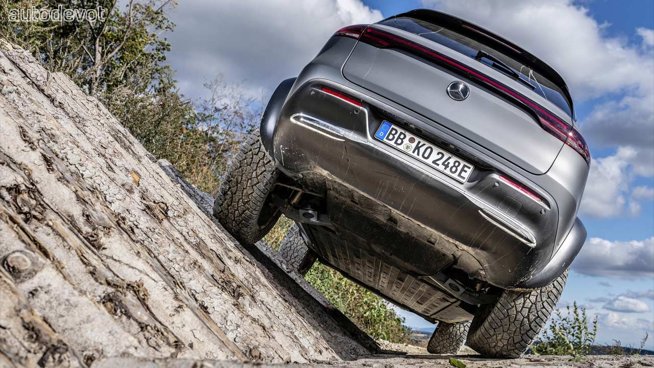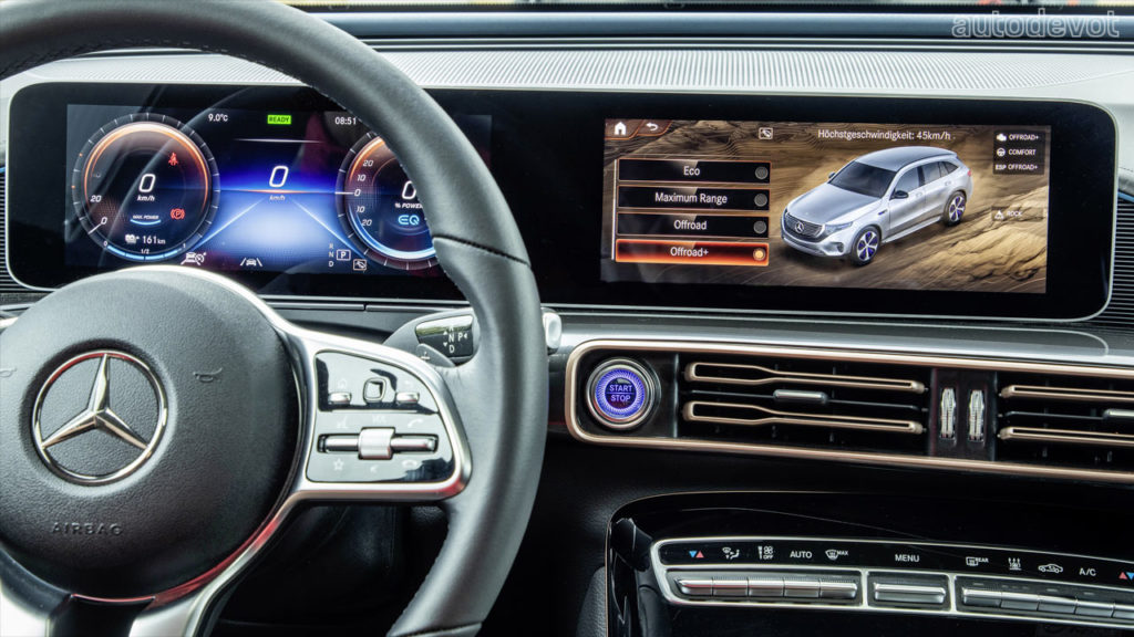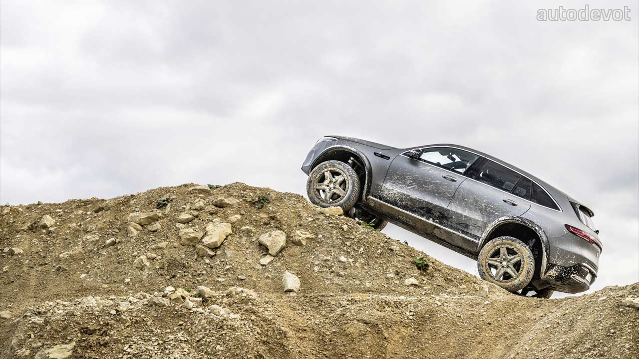 If that’s not impressive enough, it boasts approach, departure and breakover angles of 31.8-, 33.0- and 24.2-degrees, respectively. Also, its fording depth has gone up by 15 cm compared to the standard EQC; from 250 mm to 400 mm. Interestingly, the 4×4² suspension is attached to the same body mounting points as the standard suspension. The portal axles are fitted with 20-inch wheels shod with 285/50 off-road tyres.
