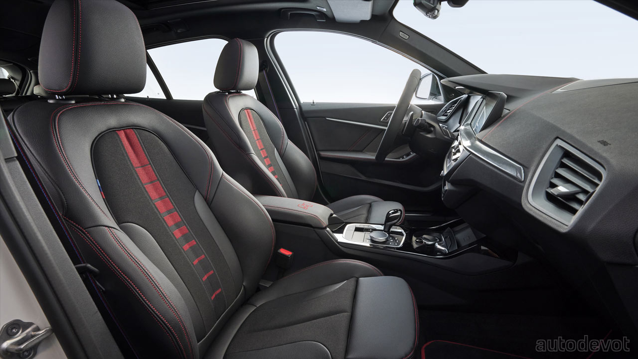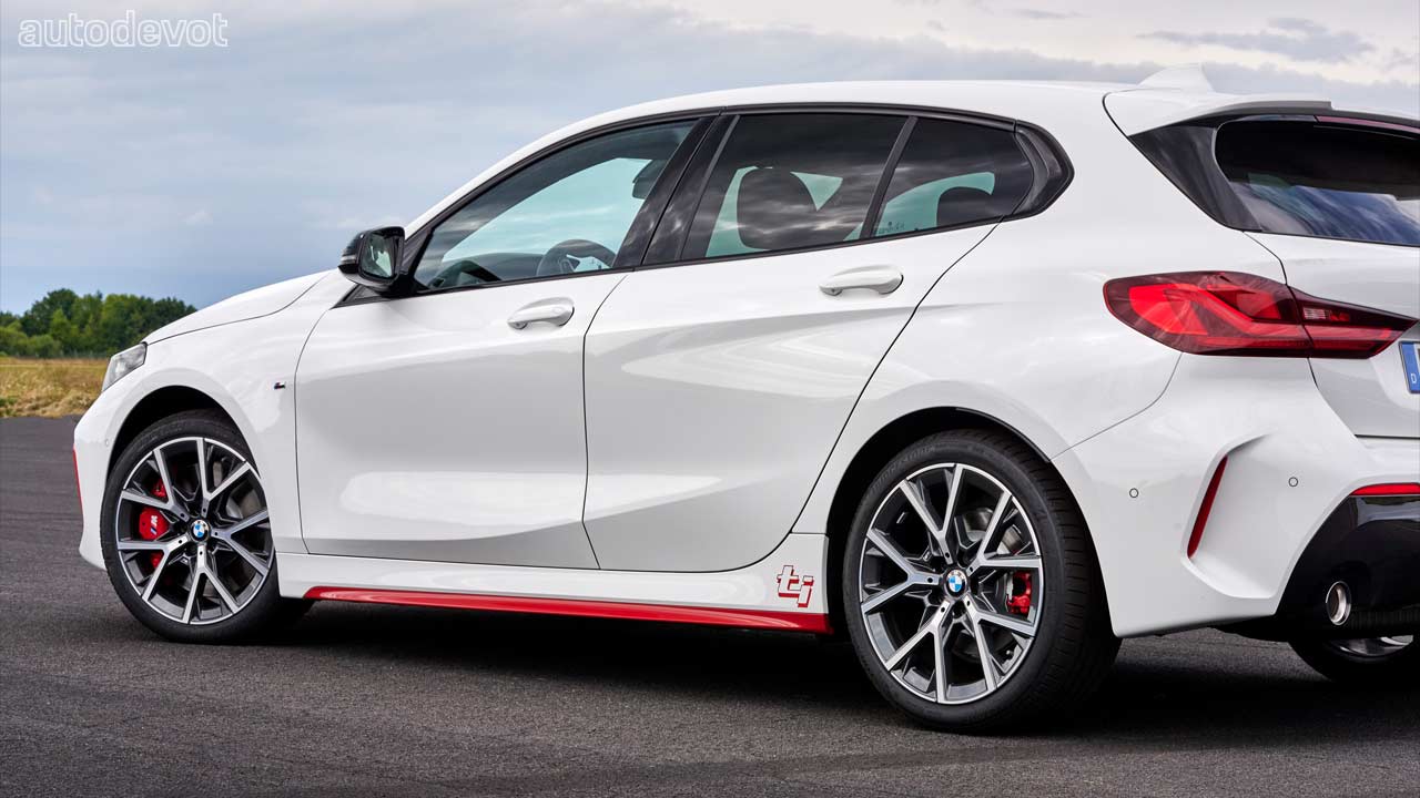 The front-wheel drive 1 Series hatchback has been injected with a sporty character with M Sport high-gloss Black elements, Red accents and of course, the ti decals. Besides Alpine White, the buyers can also choose from Melbourne Red or Misano Blue metallic paint finishes, where the accents and the ti decals can be had in black; the latter can also be deleted if desired.