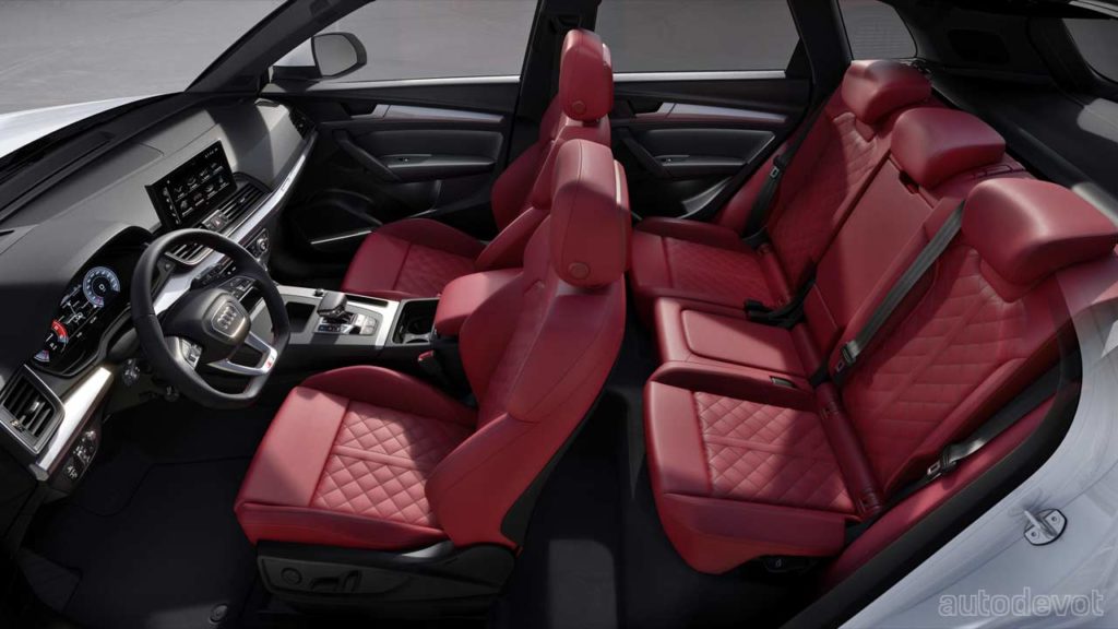 The updated SQ5 benefits from all the technological updates on the Q5 facelift, including the OLED rear lights. LED headlights come standard while the Matrix LED units with automatic high beam and dynamic turn signals are an option. As standard, the car rides on 20-inch aluminum wheels, while there’s an option for 21-inch wheels. The front discs measure 375 mm, gripped with 6-piston aluminum calipers; the calipers can be painted red as an option.