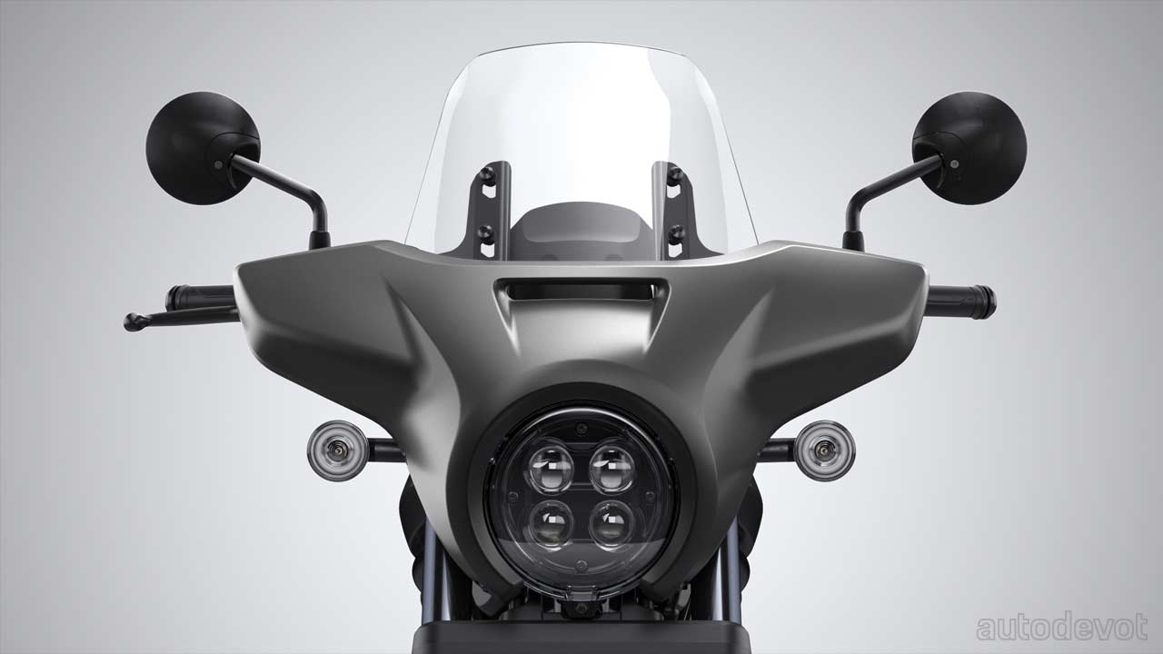 The motorcycle has a styling very similar to the CMX500 Rebel. Features include a low seat height of 27.5-inches, a digital instrument display, cruise control, 43 mm front fork, Showa rear shocks with piggyback reservoirs, and single discs measuring 330 mm at the front and 256 mm at the rear.