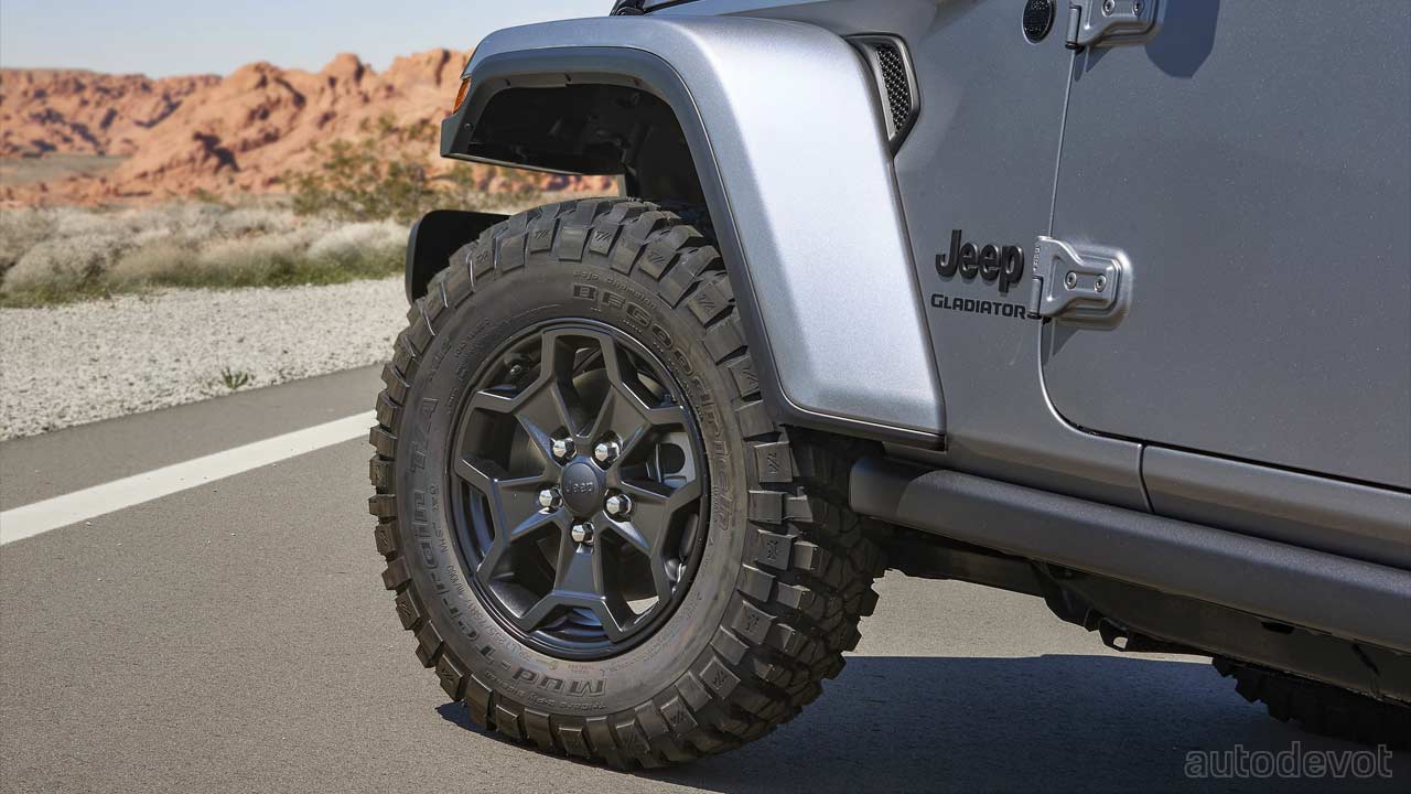 The Gladiator Willys edition will be available in 8 exterior colors: Black, Granite Crystal, Sting Gray, Billet, Firecracker Red, White, Hydro Blue and Snazzberry. Its special features include a gloss black grille, Willys hood decal, heritage 4WD tailgate decal, and unique black 17-inch aluminum wheels wrapped with BFGoodrich Mud-Terrain tyres.