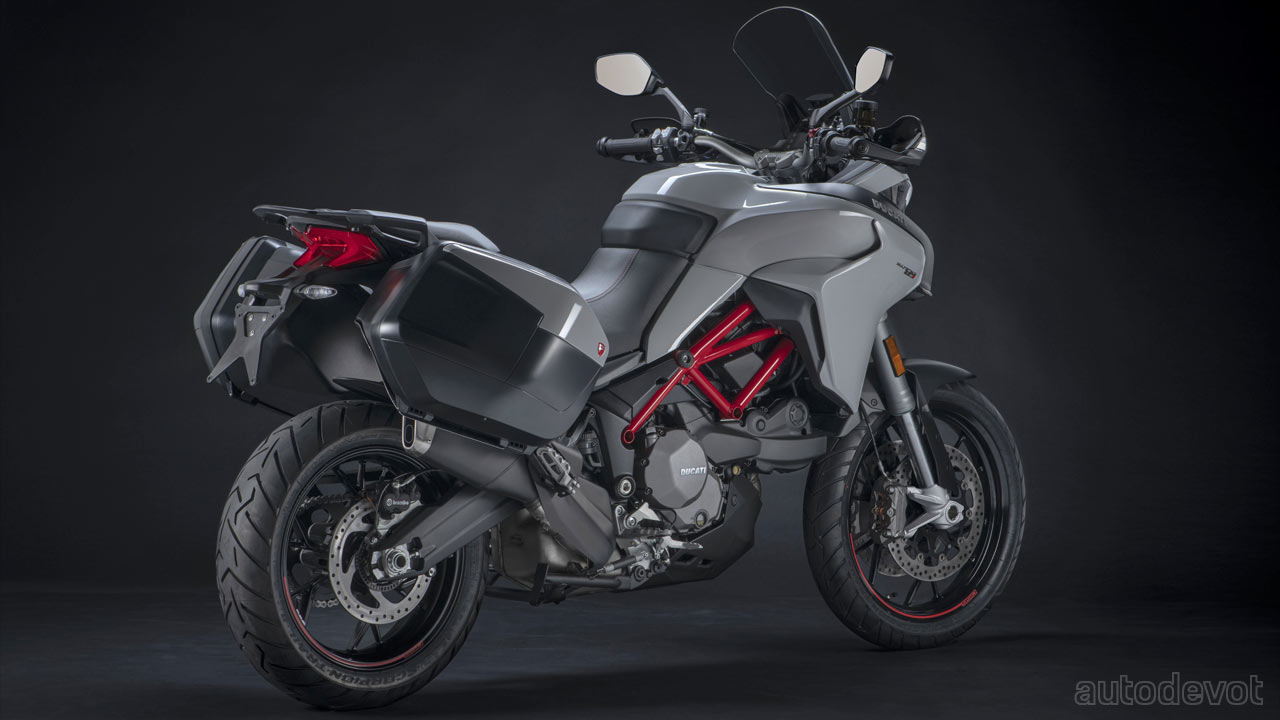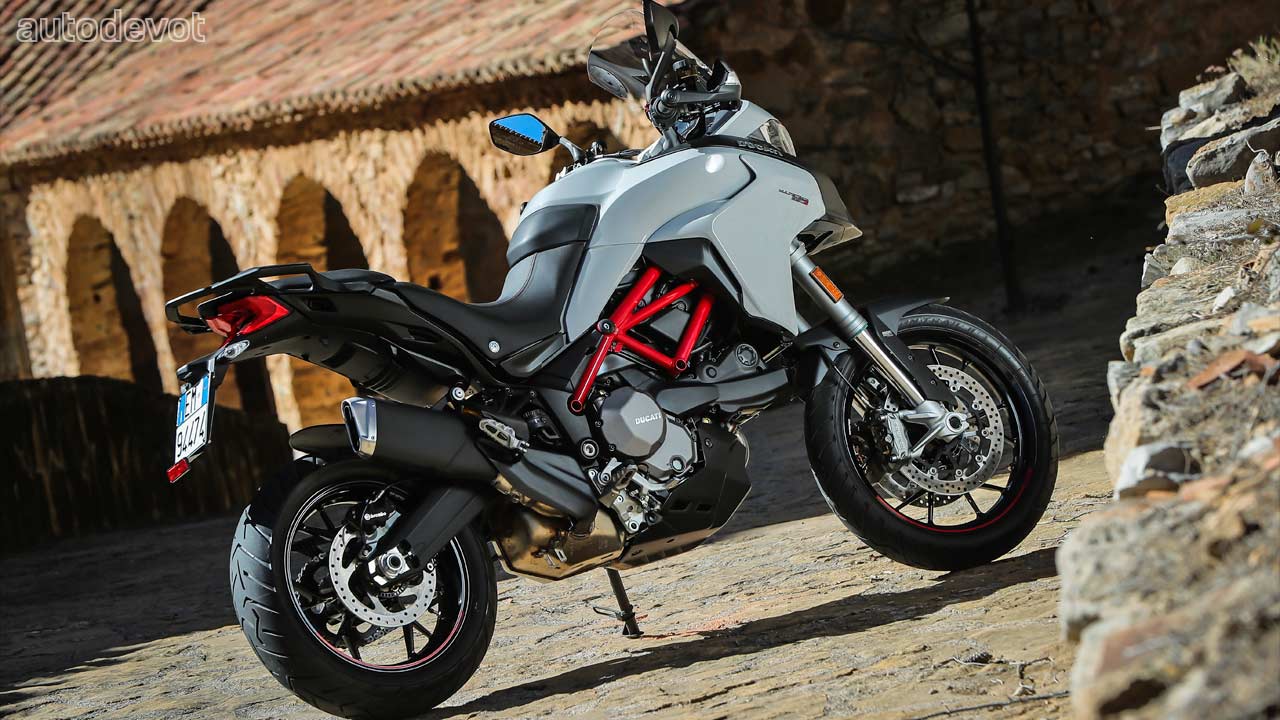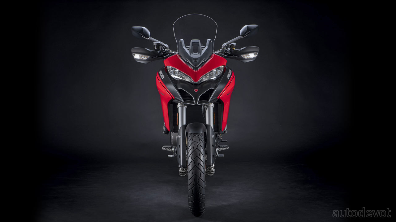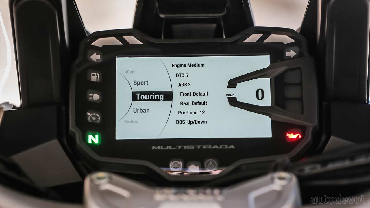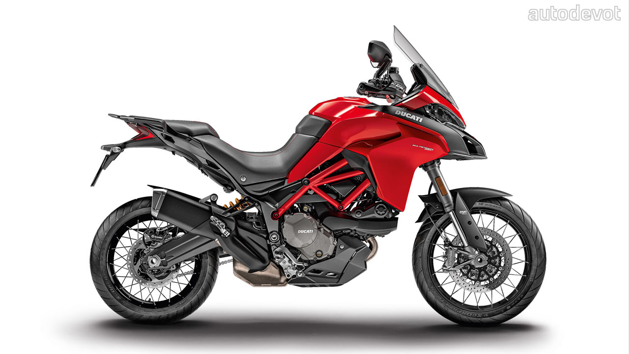 The sports touring motorcycle is built around a tubular steel trellis frame. Features include vertically adjustable fly screen, LED headlights, a 5-inch TFT display, two 12-volt power sockets and a USB port underneath the seat. The electronics package includes Bosch Cornering ABS, Ducati Traction Control (DTC), Vehicle Hold Control (VHC), Ducati Skyhook Suspension (DSS), Ducati Quick Shift up/down (DQS), Ducati Cornering Lights (DCL) and Cruise Control.