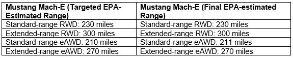 The standard-range rear-wheel-drive Mustang Mach-E meets its targeted EPA-estimated range of 230 miles (370 km), while the standard-range all-wheel-drive model exceeds its 210 miles of targeted range by a mile (339.5 km).