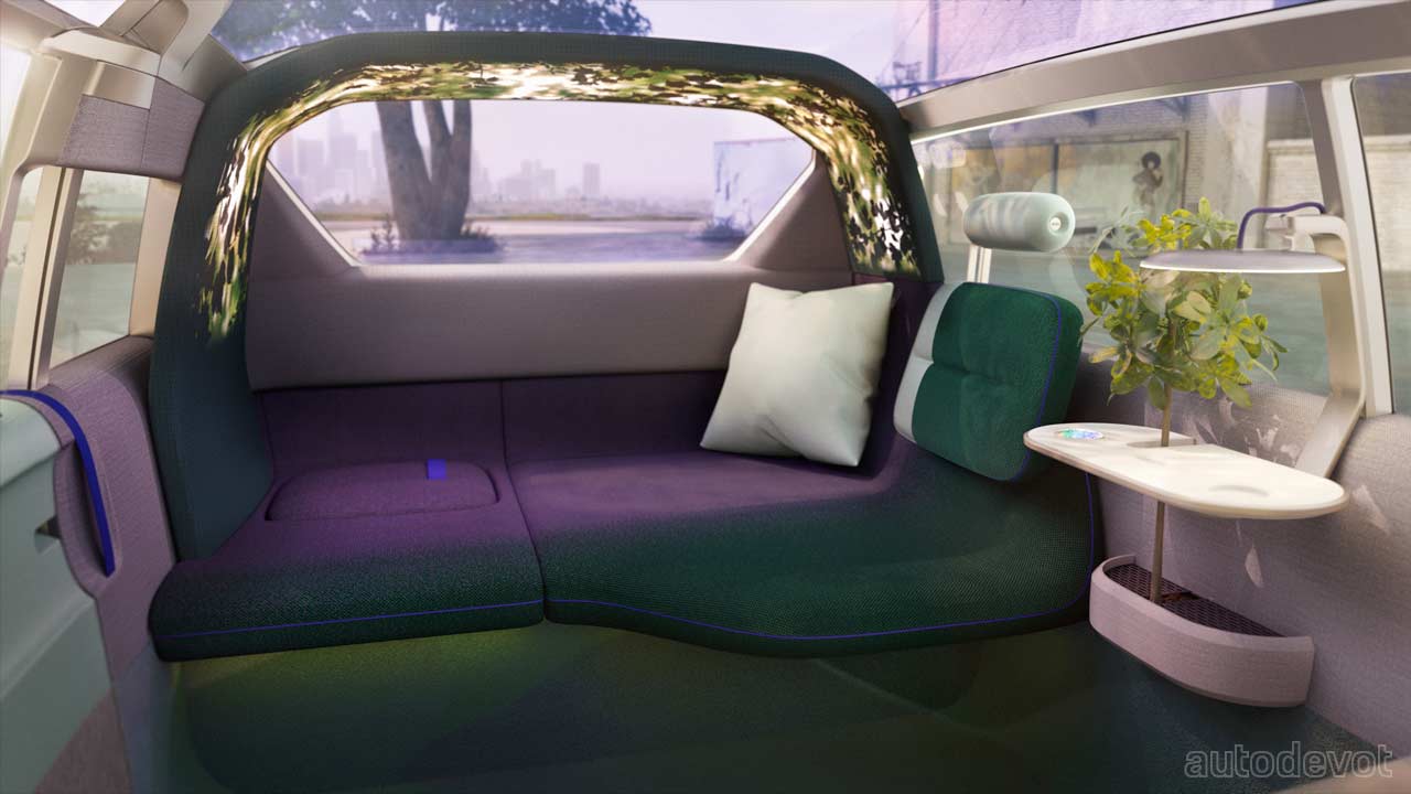 Speaking of which, the vehicle offers two spaces: Daybed and Street Balcony, and Cosy Corner. The Cosy Corner is fairly self-explanatory; it’s like a corner of a lounge, with an LED-backlit loop over it, creating an experience of relaxing underneath a tree. As for the front section, the dashboard gets lowered with the steering wheel retracted to become a “Daybed”, when driving in automated mode or maybe relaxing somewhere on an adventure, for example.