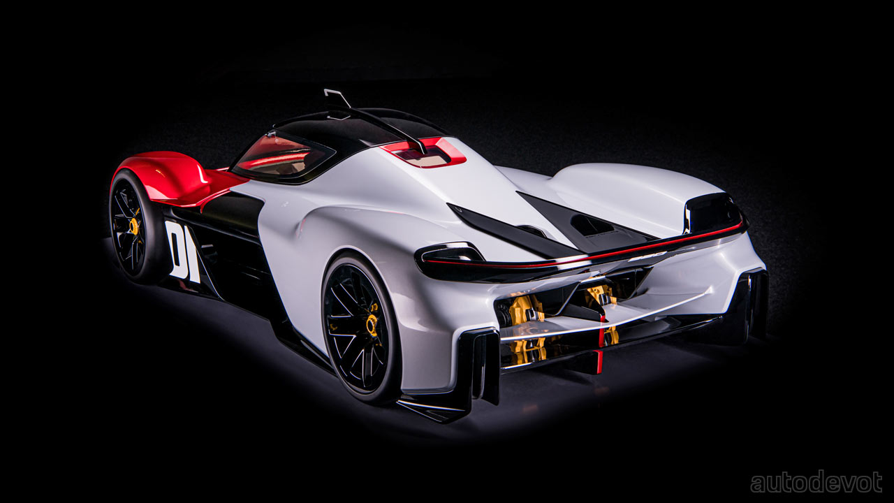 The next one is the Vision 920, also created last year, and remains as a 1:1 scale hard model. The design team wanted to create an extreme hypercar with the next level aerodynamics; a tiny cockpit with a central driving position; and a driving experience that makes everything around you look blurry.