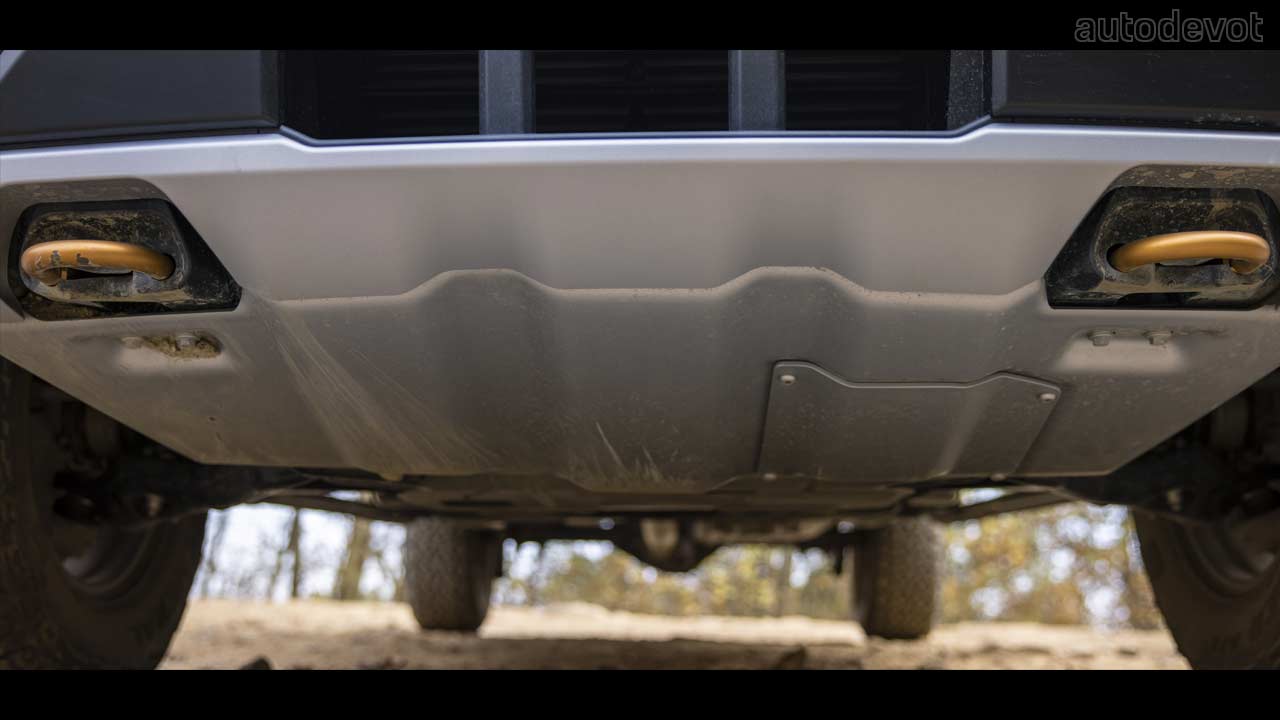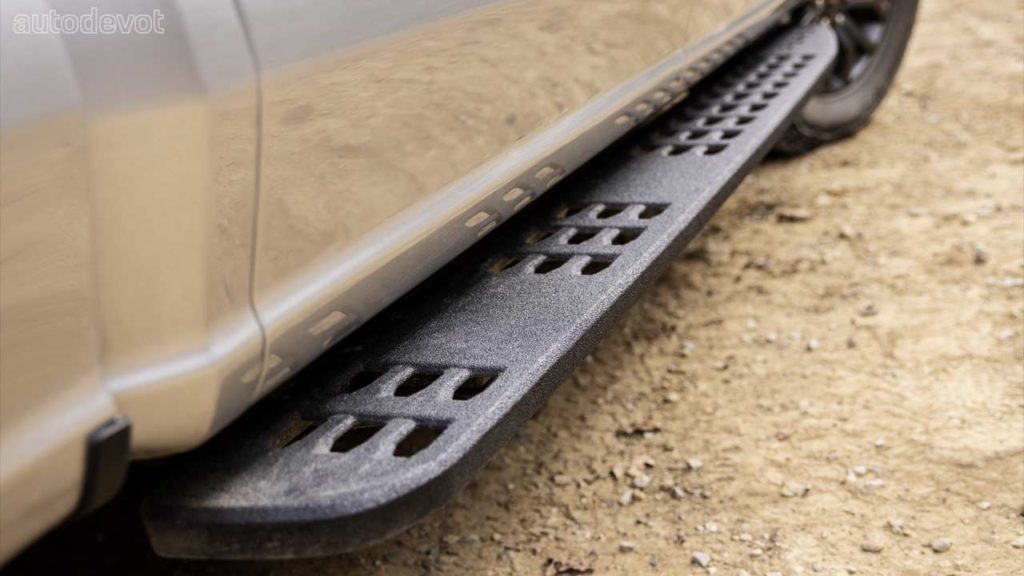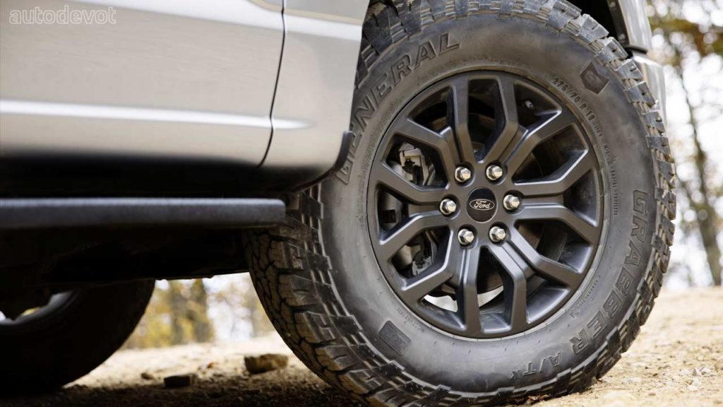 The truck also gets Raptor-inspired off-road fixed running boards, matte-finished 18-inch wheels wrapped with 33-inch General Grabber all-terrain tires, and a Raptor-style front skid plate. The Tremor has an inch wider stance.