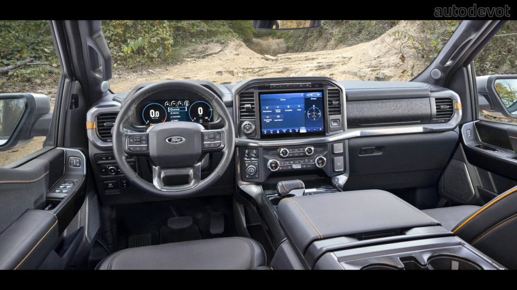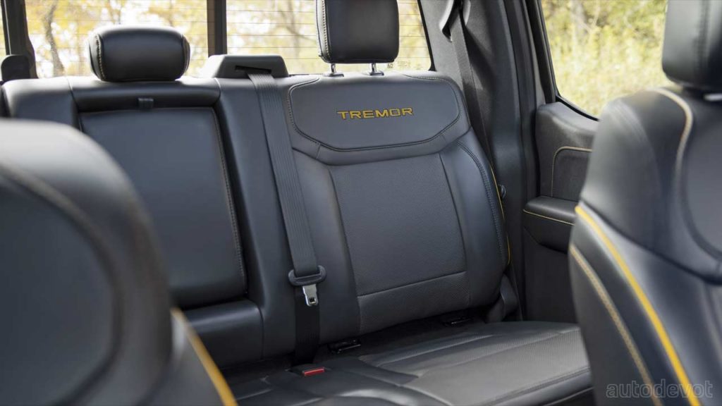 As for visual differentiation, the F-150 Tremor features a unique grille with a blacked-out Ford oval, flanked by Active Orange line on either side. The same color can be found on the front tow hooks and on the Tremor badges as well.