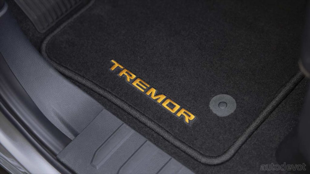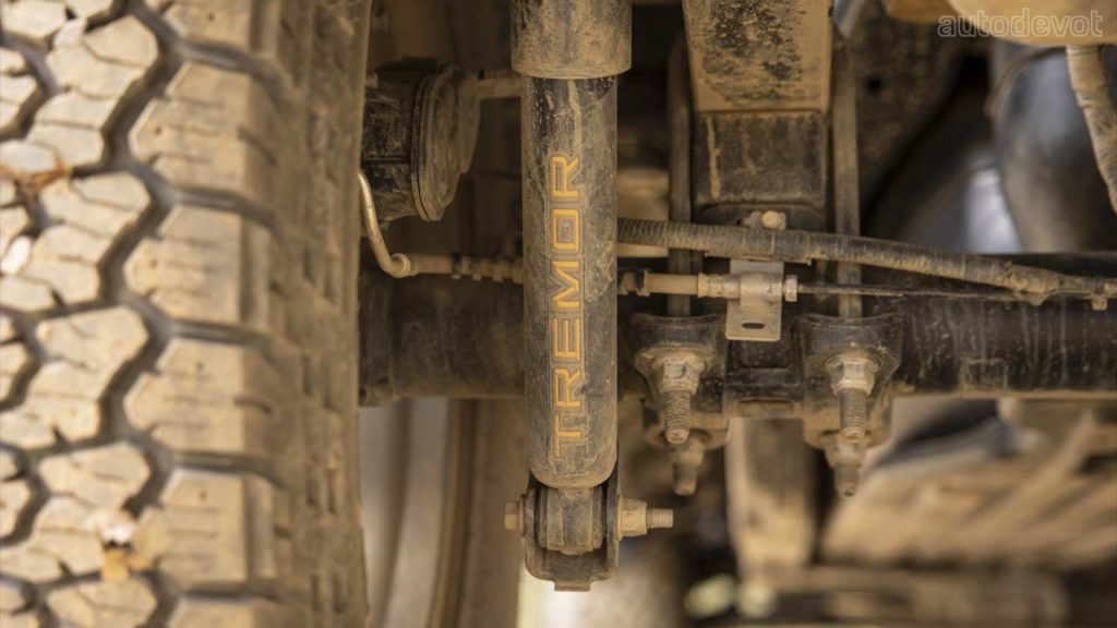 The upgraded suspension starts with retuned springs front and rear for added ground clearance. Front hub knuckles and upper control arms are revised while Tremor-specific monotube shocks at the front, and twin tube shocks at the rear are tuned for softer damping at low speeds, with additional damping and control for more severe off-road events, Ford said.