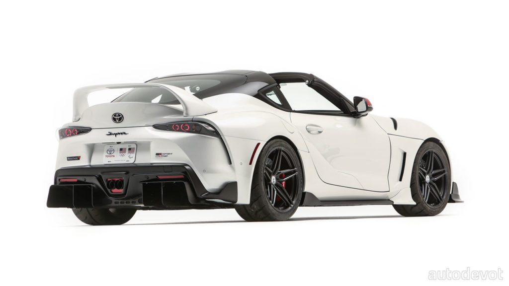 Called the GR Supra Sport Top, it is apparently, an open-air tribute to removable-top Supra models of the past. Meaning, unlike the 911 Targa, for example, there’s no convertible mechanism here. The roof (two composite panels) needs to be manually removed and stowed somewhere, maybe in the car’s trunk. Also, Toyota said that the crew ensured structural rigidity by reinforcing large sections of the vehicle’s frame.