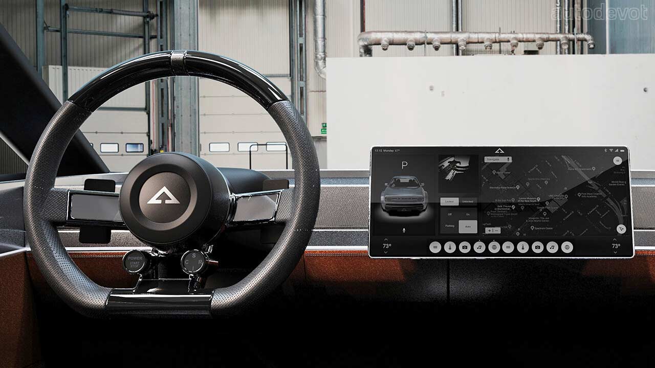 The cabin is minimalistic and attempts to combine a retro layout with modern technologies. Notice the flat-bottom steering wheel with circular knobs; the left one is for power while the right one is for modes. Those massive paddles behind the wheel appear to be for setting the level of regeneration. And, I’ve no clue where the air vents are.