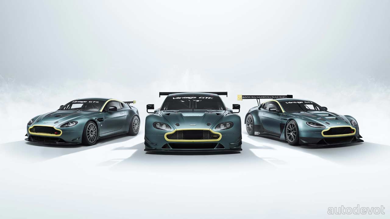 All three cars in the collection, a V8 Vantage GTE, a V12 Vantage GT3 and Vantage GT4, are liveried in sterling green with classic Aston Martin yellow accents.