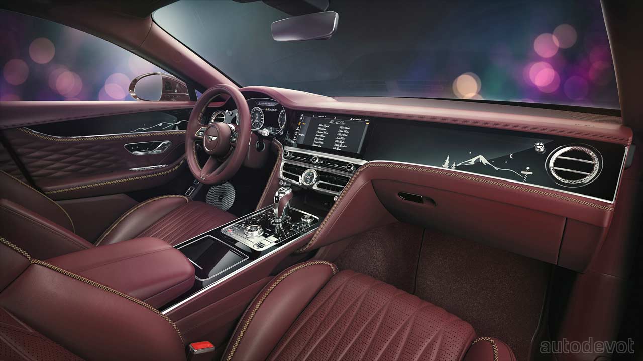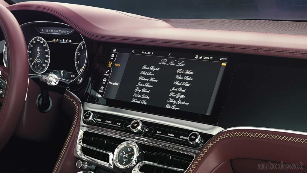 In the cabin, the Grand Black veneer on the dashboard and door cards showcases a North Pole winter night scene. The matching monotone Cricket Bauble leather features gold cross-stitch highlights. In fact, the customer’s name has been stitched into the driver’s seat and that of his wife alongside. Also, a welcome sound of sleigh bells jingling plays when the start button is pressed, followed by the Bentley Rotating Display revealing a 12.3-inch touchscreen. The display features a ‘Naughty’ and ‘Nice’ list, integrated into the navigation system, which apparently lets him know whether his fans have been bad or good.