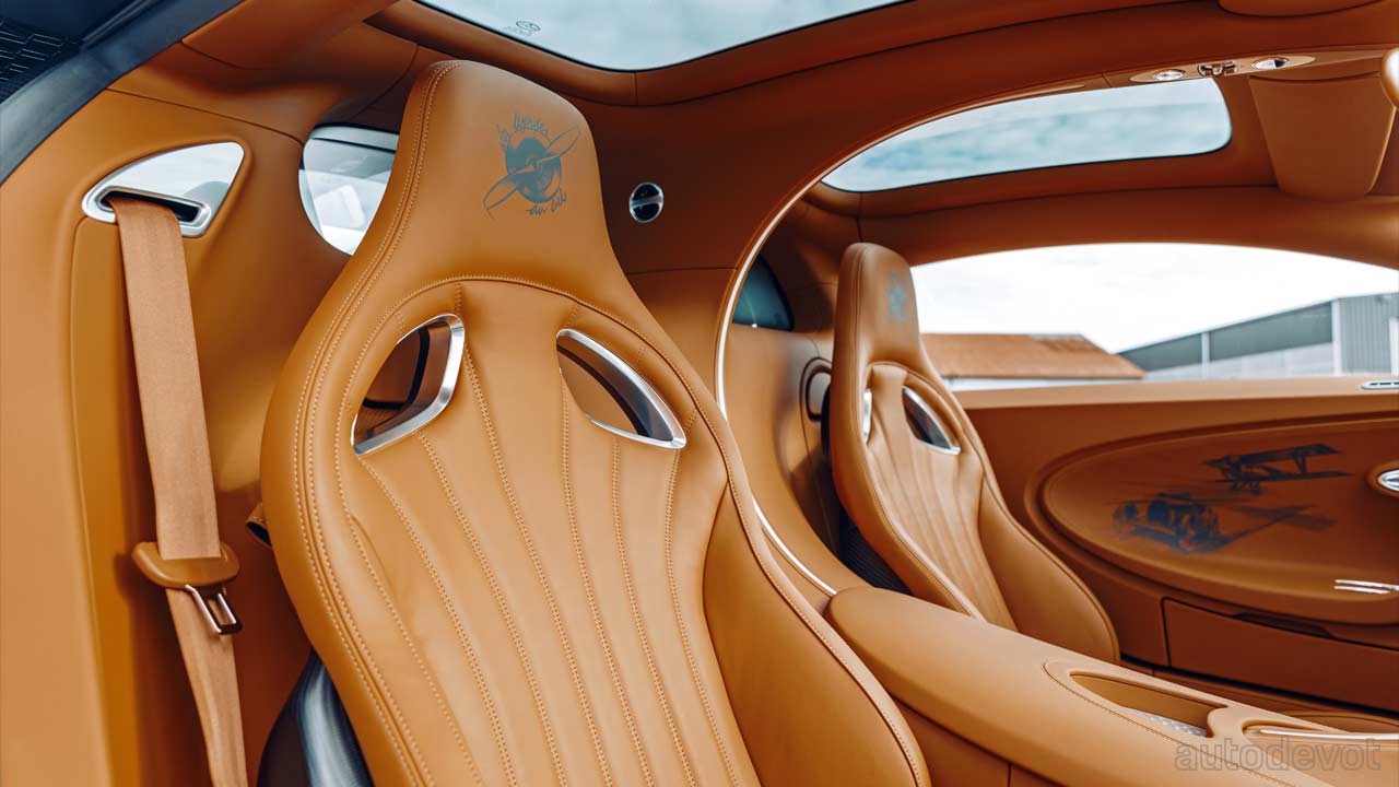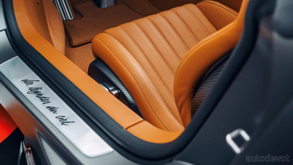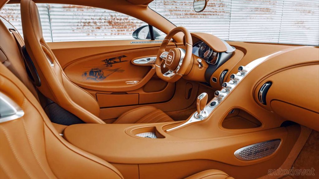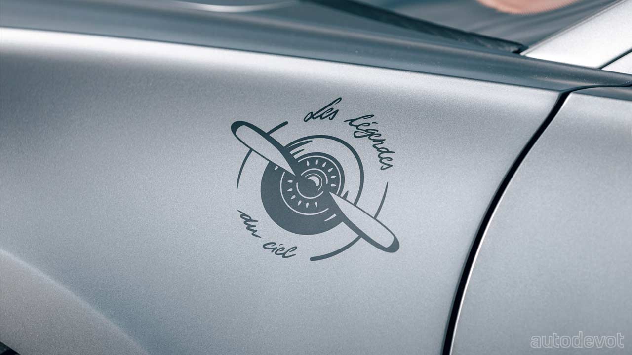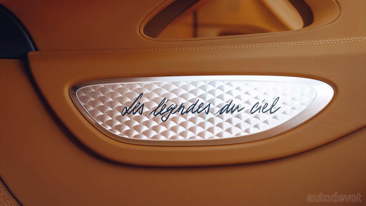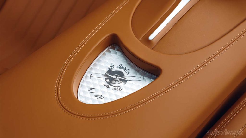 In the cockpit, the door panels feature a hand-sketched racing scene between the Nieuport 17 aircraft and a Bugatti Type 13, while the centre console features aluminum plaques with “Les Légendes du Ciel” letters and logo. The logo can be found on the headrests as well. The light brown leather upholstery is reminiscent of natural leather in those past aircrafts.