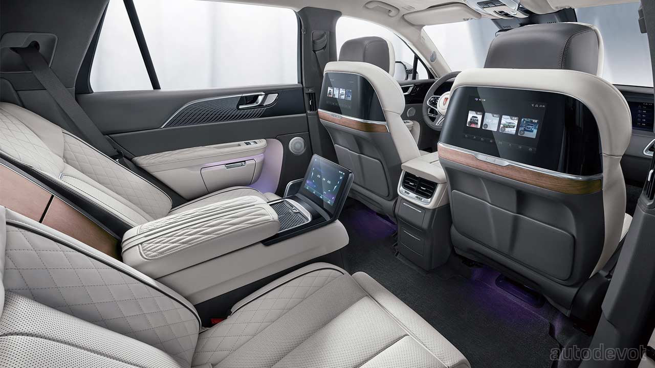 The luxurious cabin is full of displays; the ones integrated into the front seat backrests look pretty cool. The E-HS9’s feature list includes AR-HUD and Level 4 automated parking. For driver assistance and active safety systems, the SUV is equipped with a total of 26 sensors and V2X communication technology.